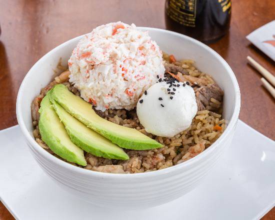 Arroz frito con verduras, res, pollo y tocino finamente picados, acompañado de Philadelphia, tampico y aguacate.