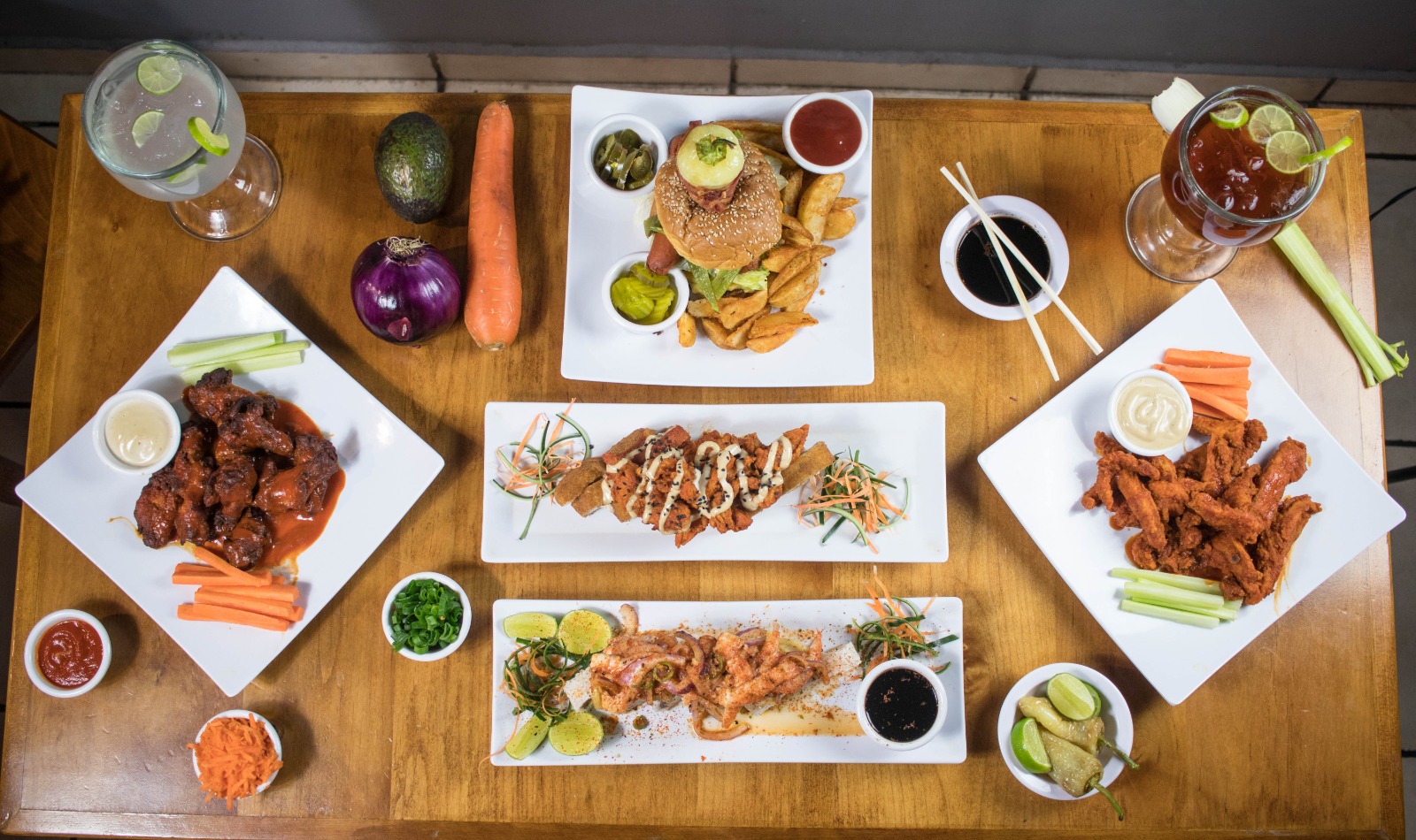 Pechuga de pollo en tiras, empanizadas y bañadas en la salsa de su elección, acompañadas de apio, zanahoria y aderezo.