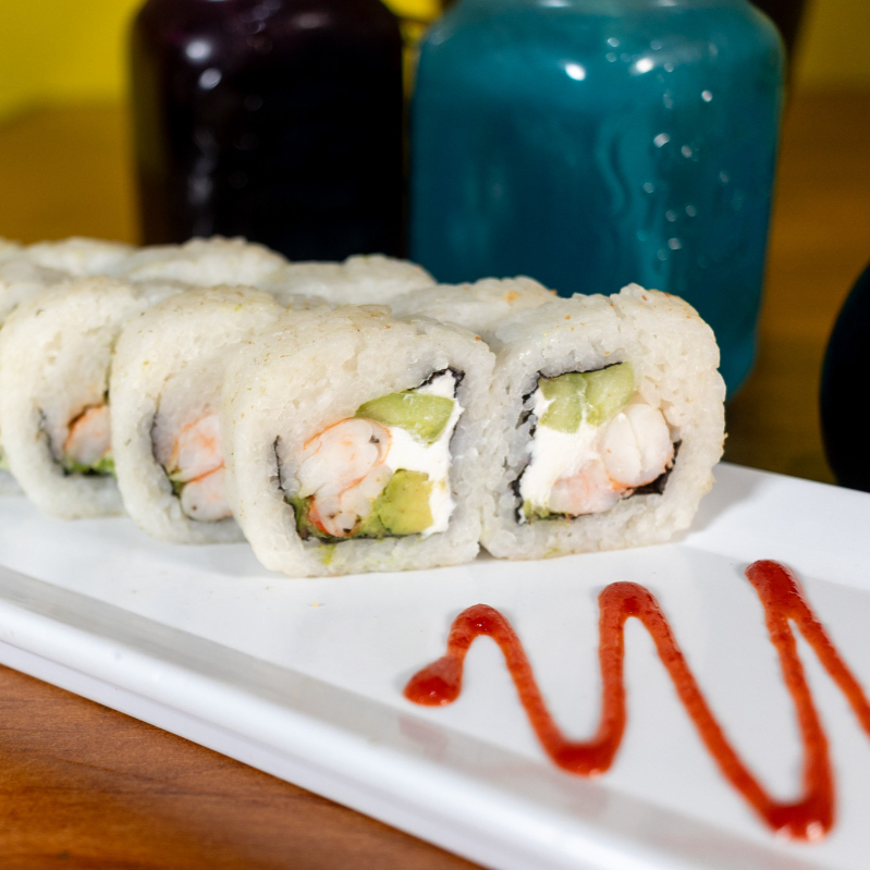 Philadelphia, aguacate, pepino y camarón por dentro.