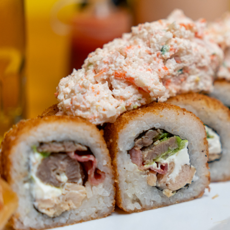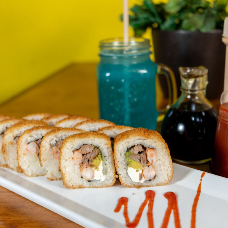 Philadelphia, aguacate, pollo, res y tocino por dentro, acompañado de tampico, zanahoria, cebollin, aderezo chipotle y soya.