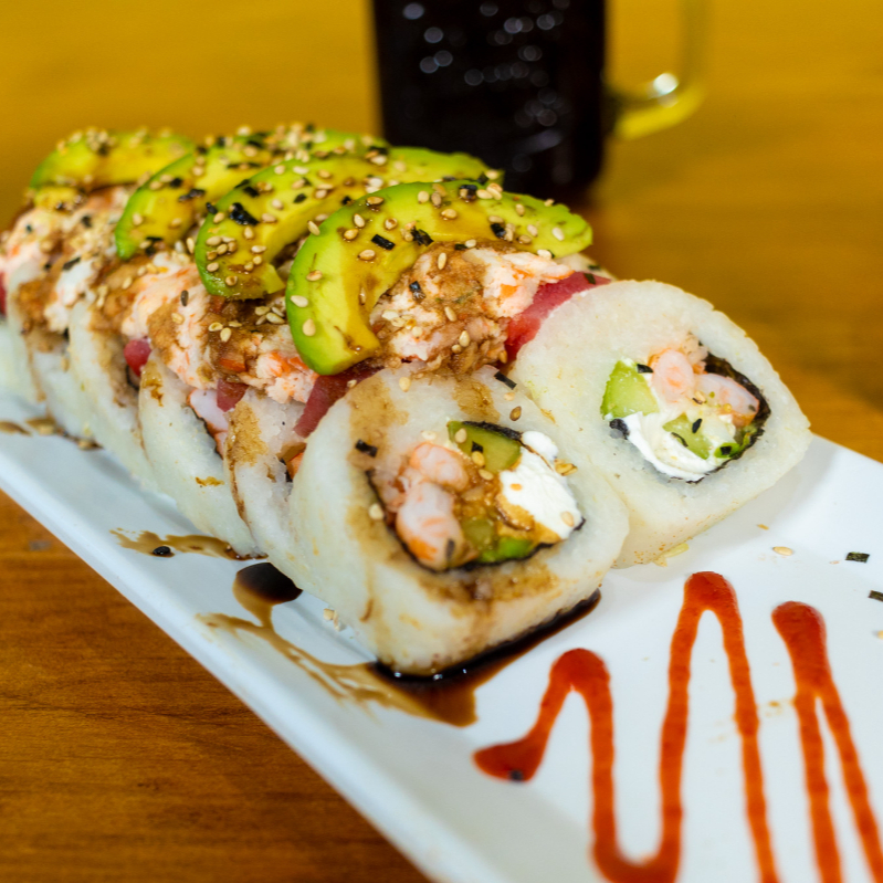 Philadelphia, aguacate, pepino y pulpo por dentro con topping de camarón empanizado, kanikama y aderezo spicy, rayado en salsa de anguila y acompañado de zanahoria, cebollin, aderezo chipotle y soya.