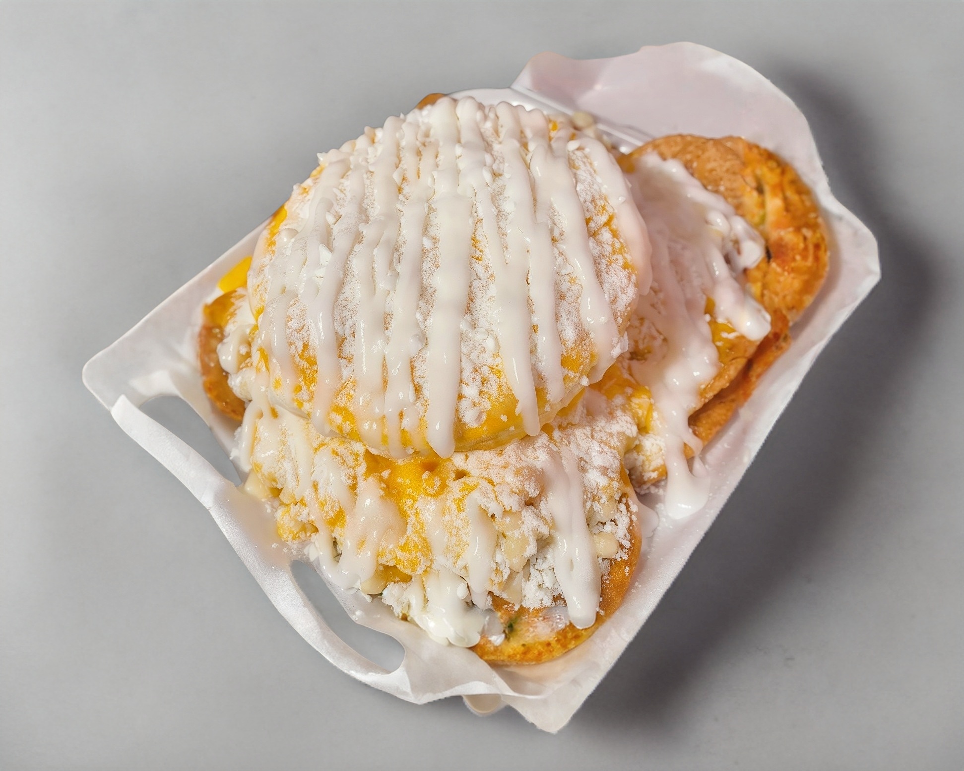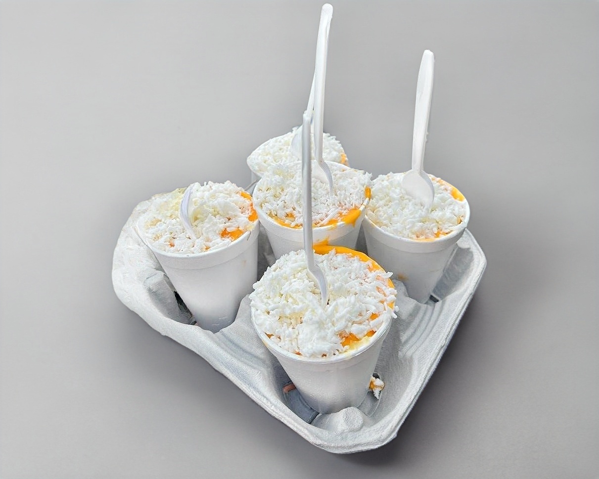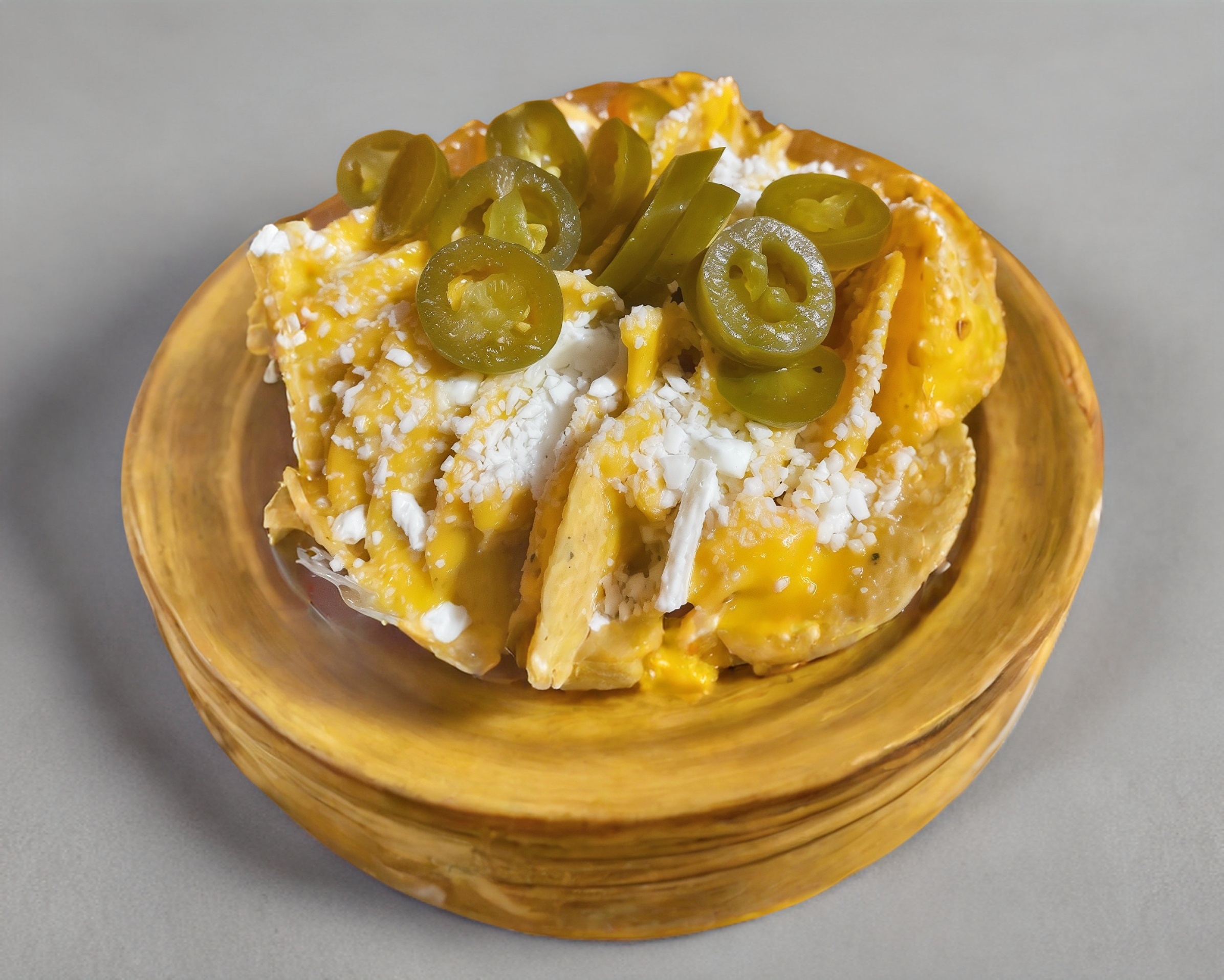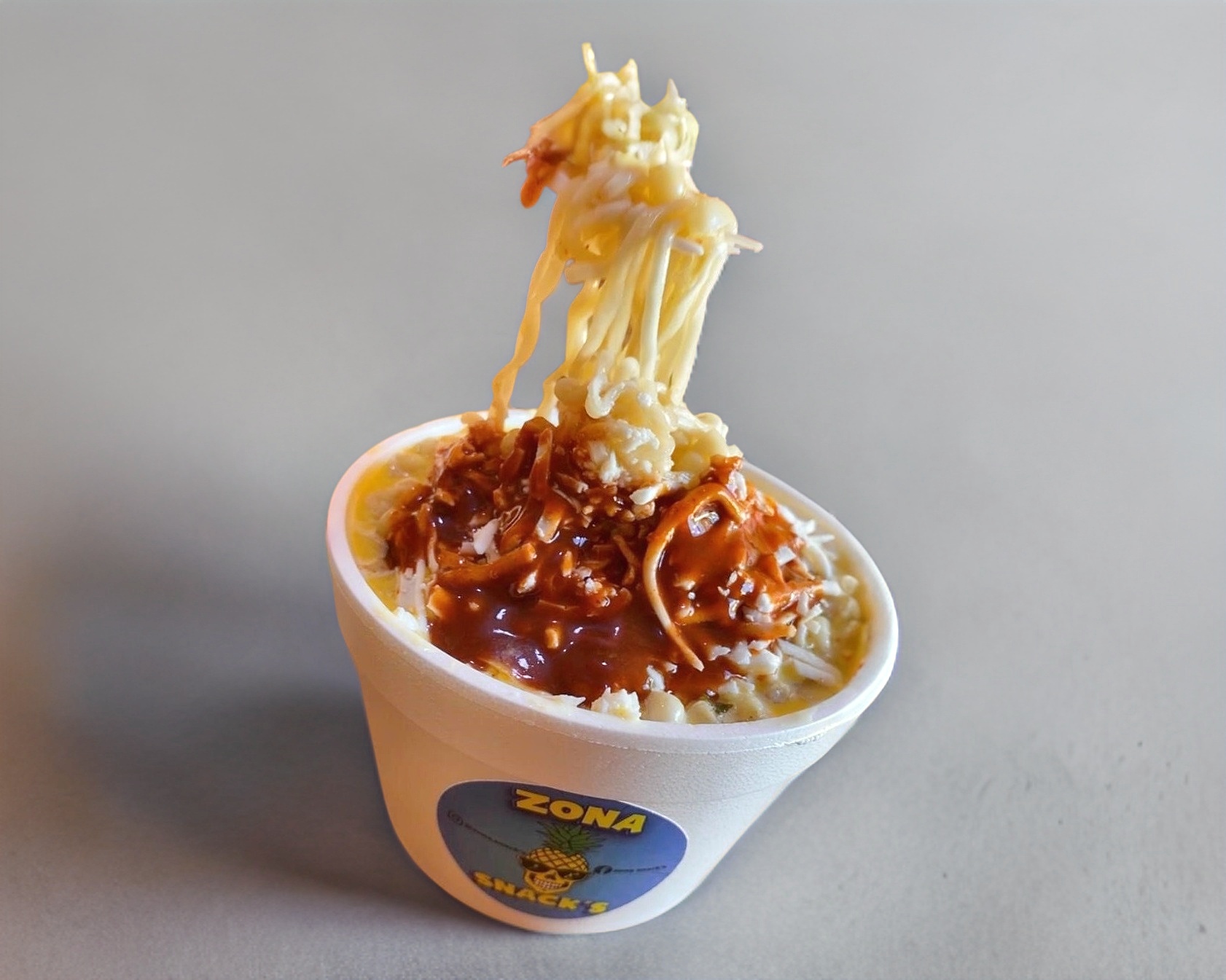 Queso amarillo, elote, crema y queso blanco rallado. Picante.