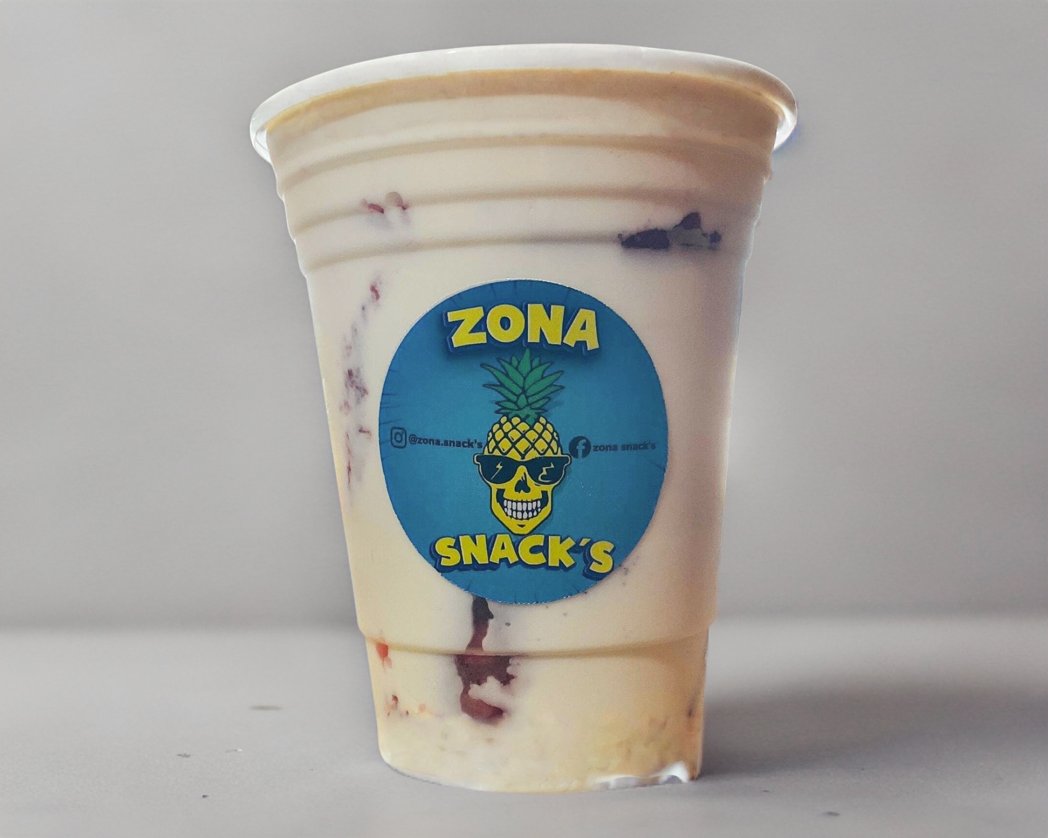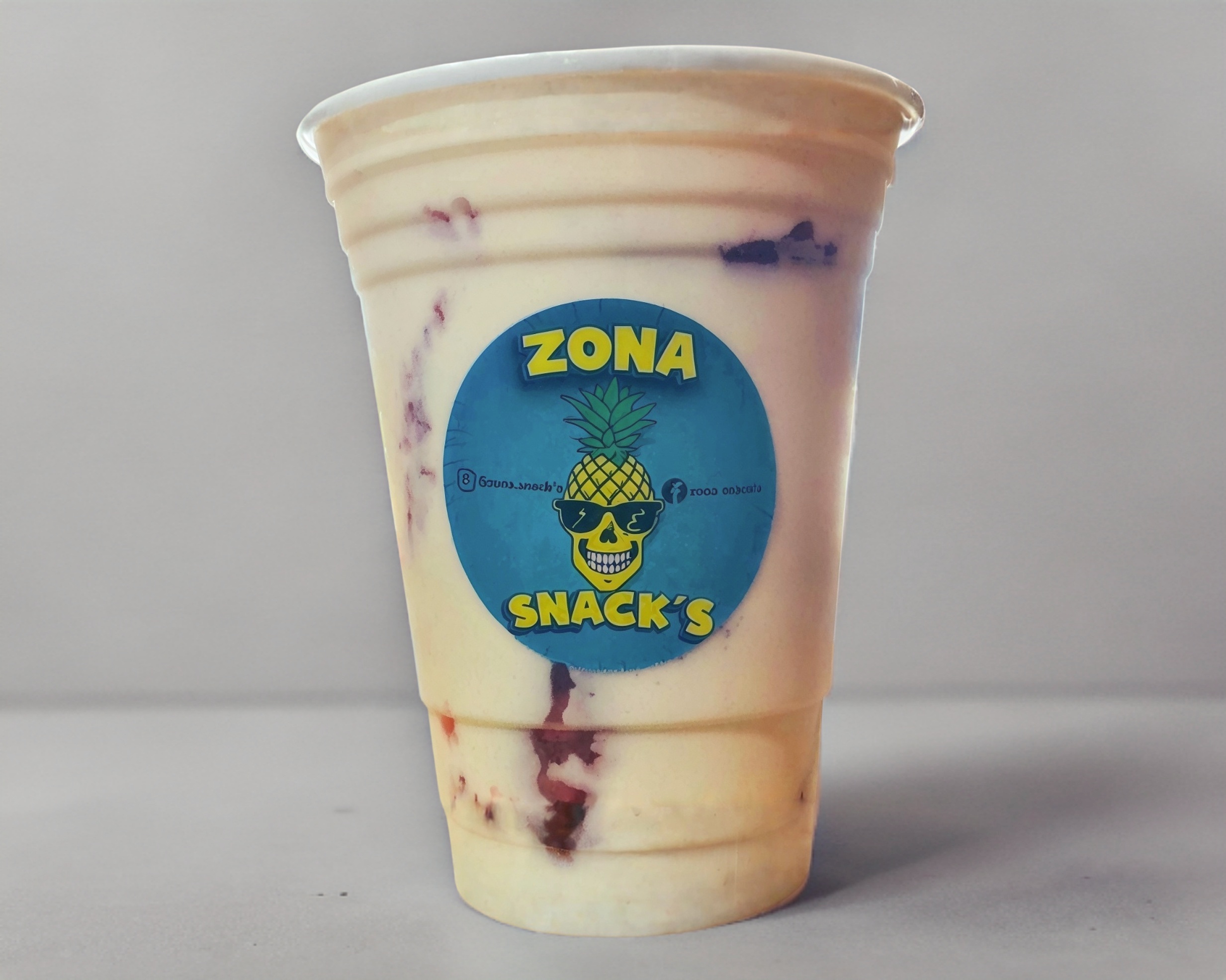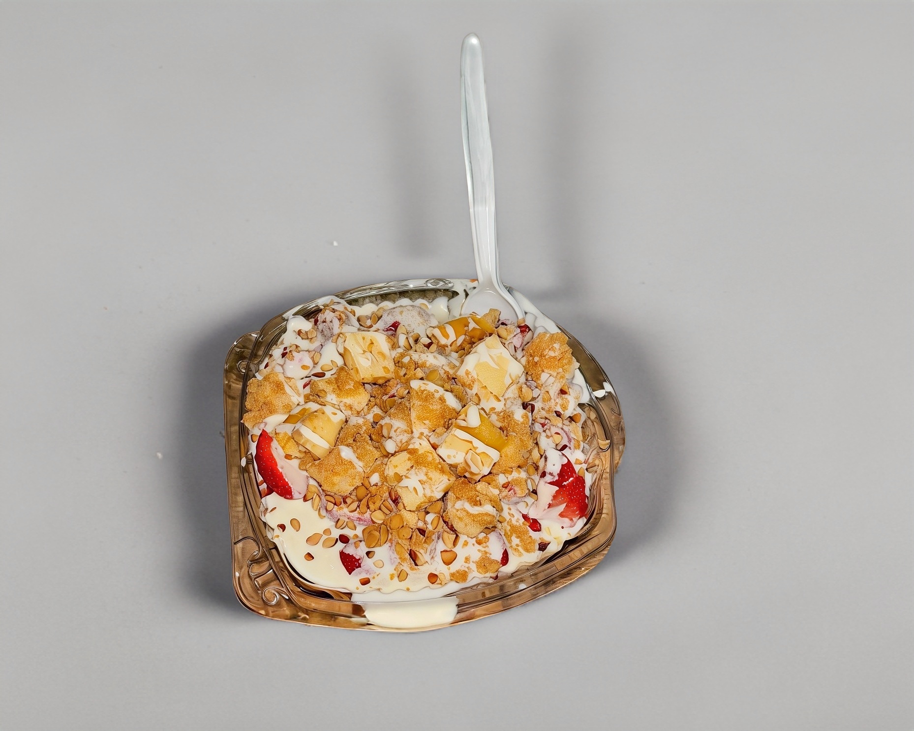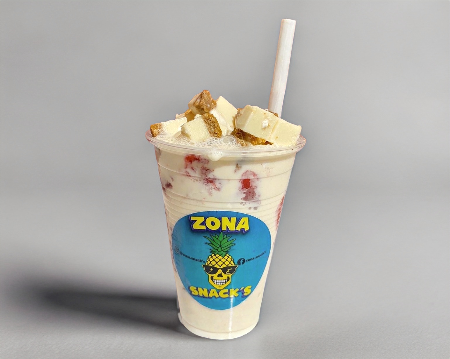 Charolita de fresas naturales con trozos de pay, nuestra deliciosa crema y topping nuez.