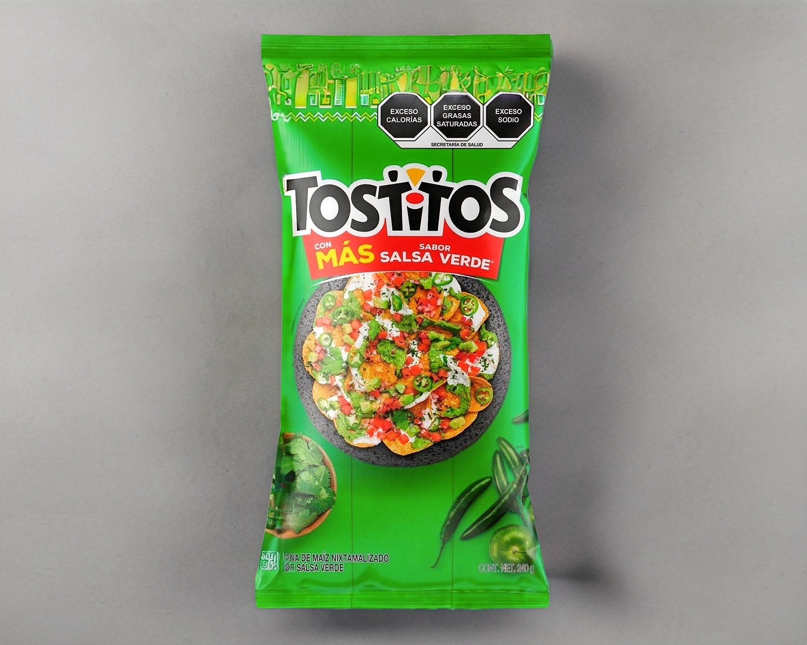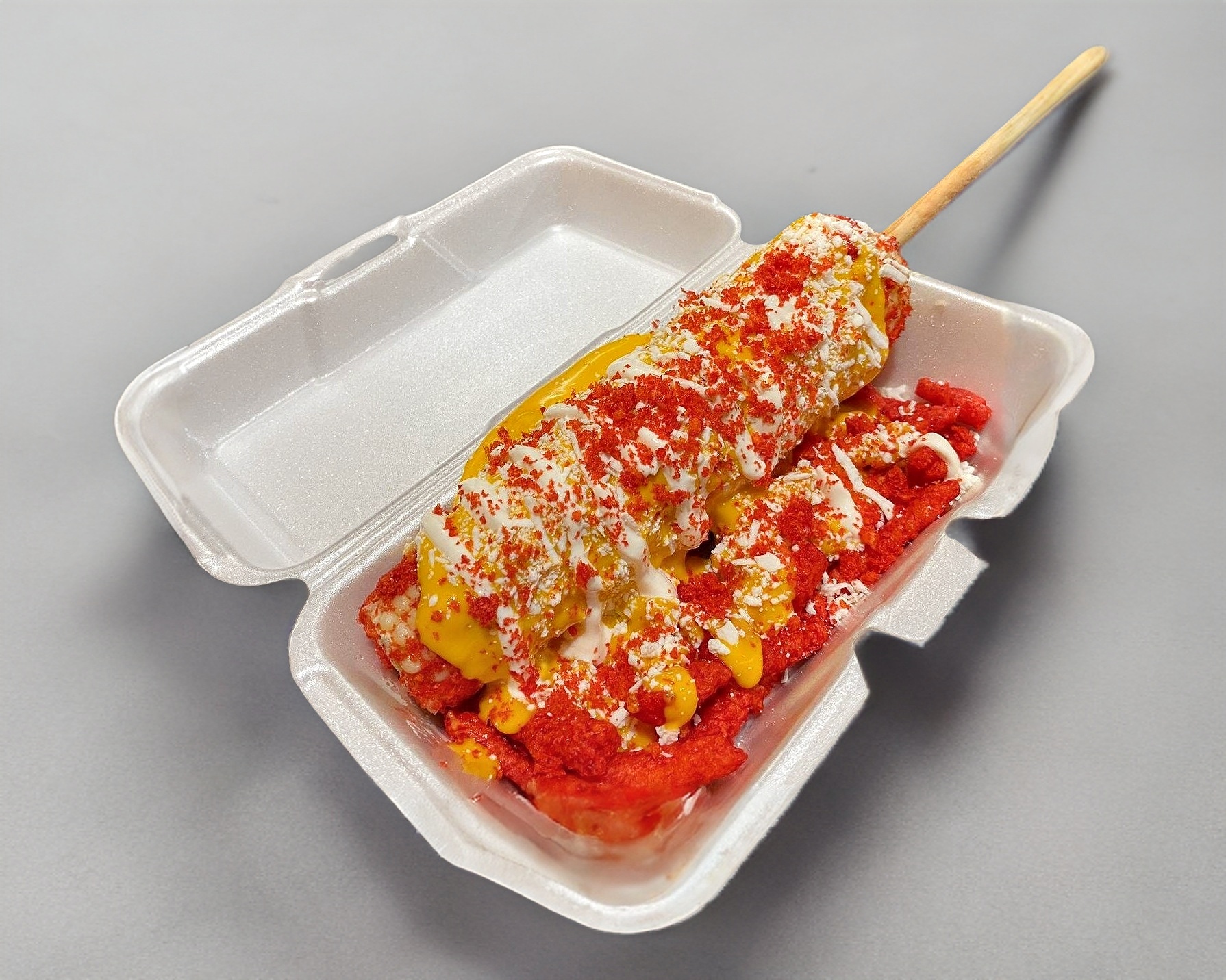 Elote entero con polvo de cheetos flamin' hot, tostitos verdes, ruffles...