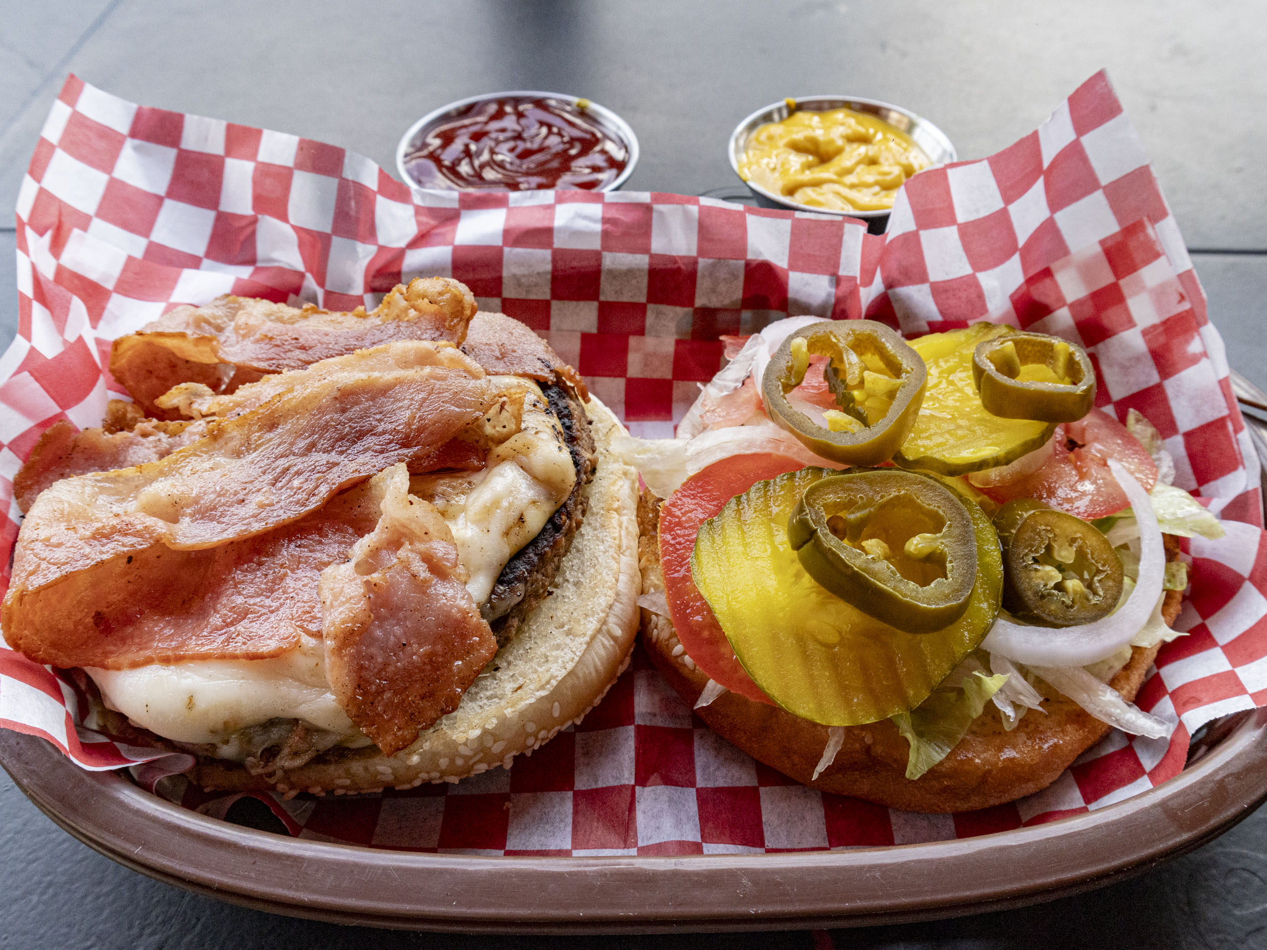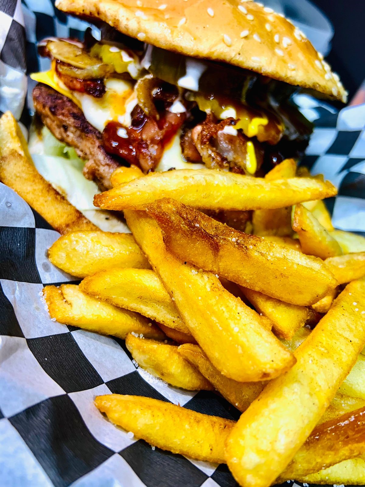 200 Gr de sirloin, tocino, cebolla caramelizada, salsa BBQ, queso blanco, vegetales , pepinillo.