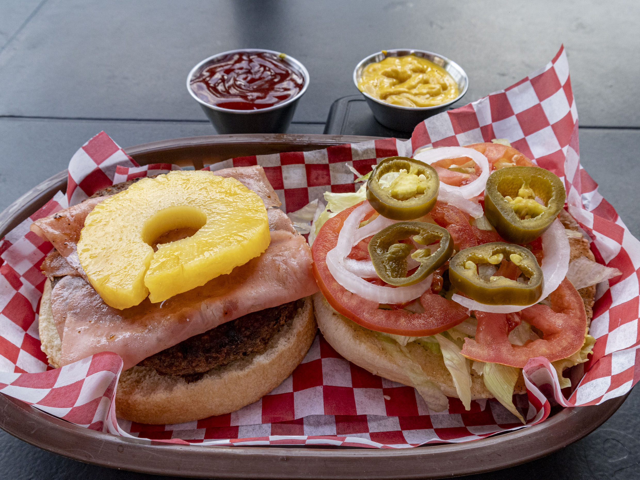 200 Gr sirloin, piña, cebolla caramelizada, jamón, vegetales.