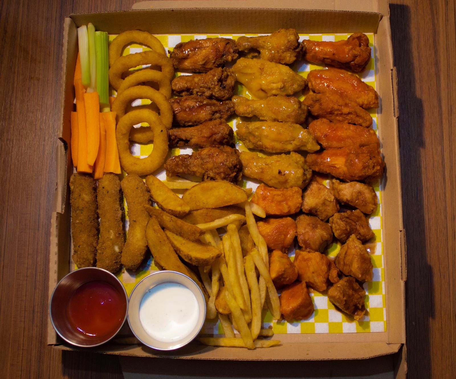 15 alitas, 12 boneless, 5 aros de cebolla, 3 dedos queso, papas francesas, vegetales, aderezos y rfresco familiar.