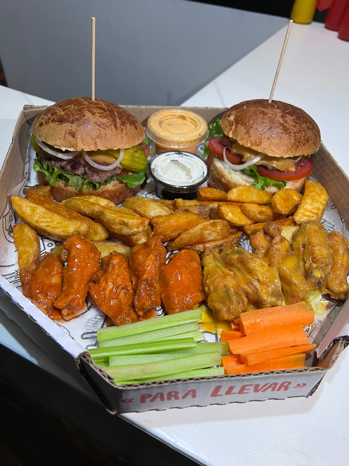 2 hamburguesas clasicas, medio kg alitas,papas, vegetales y aderezos.