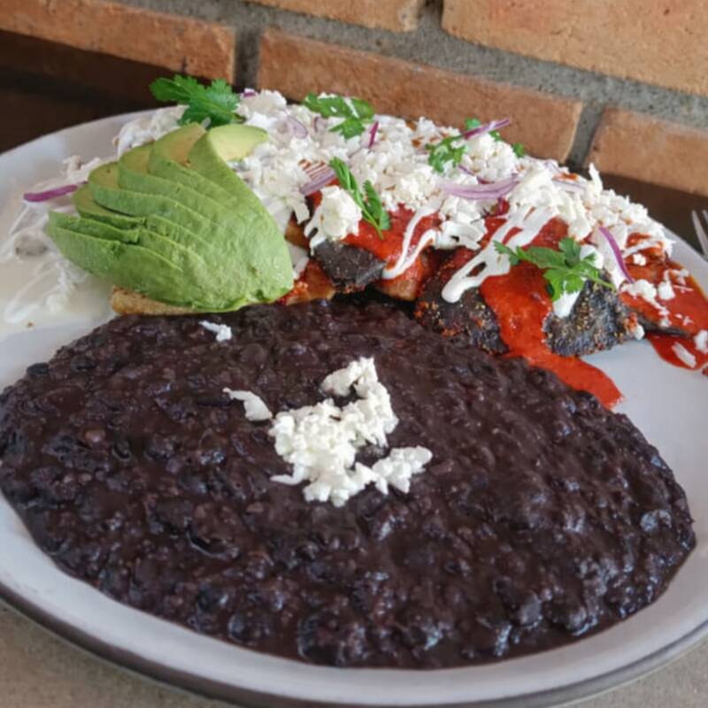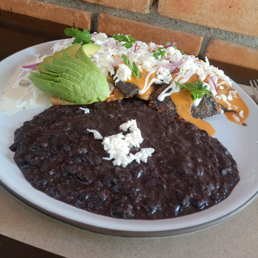 Bañadas en salsa de frijol de ligero picor, con cebolla encurtida, crema y aguacate, rellenas de pollo o queso panela.