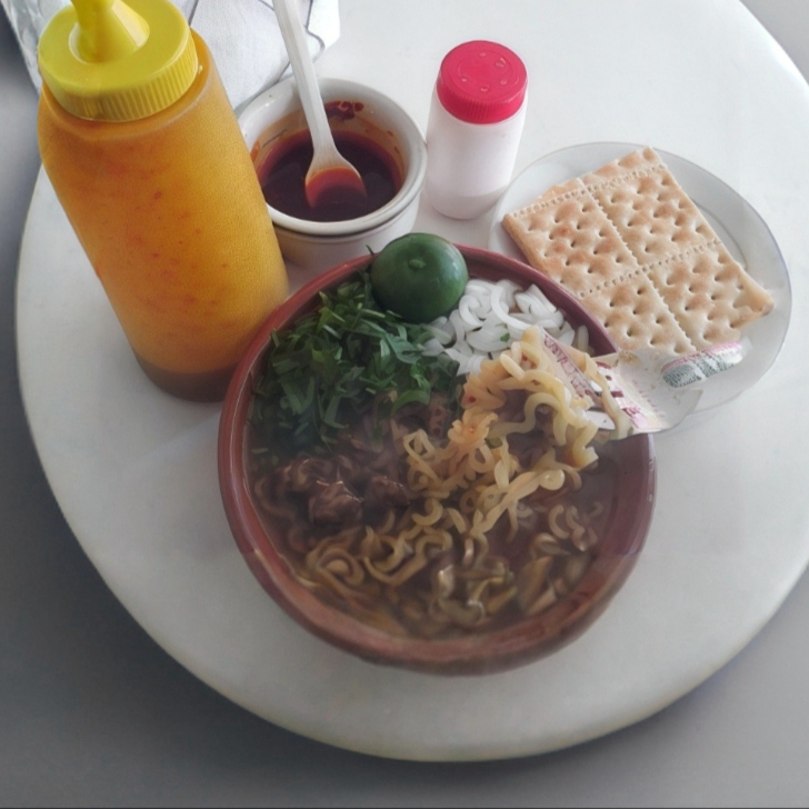 1/2 litro de consomé con carne (la carne va dentro del consomé), incluye tortillas, verduras y salsas.