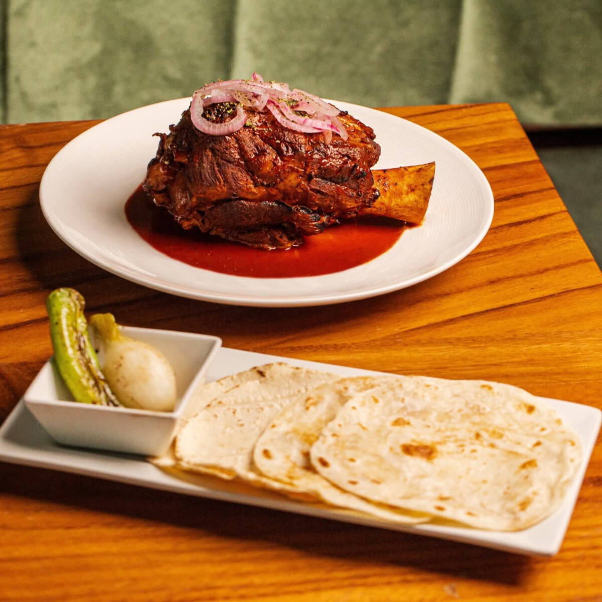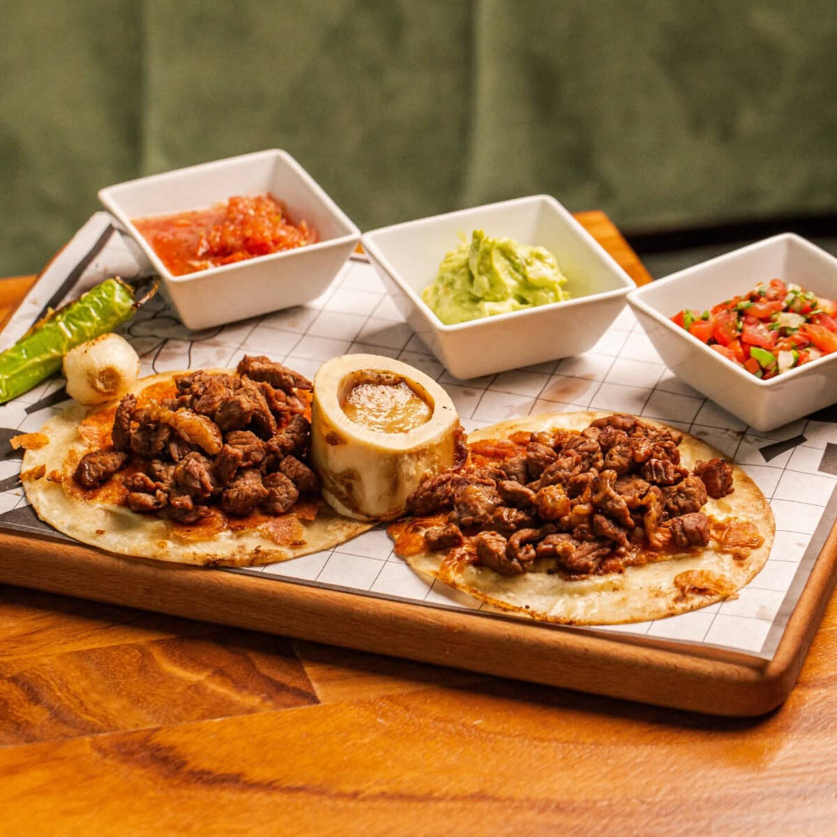 tierno filete de ribeye acompañado de tortillas de maiz o harina con costra de queso ,tuetano guacamole y cebollitas