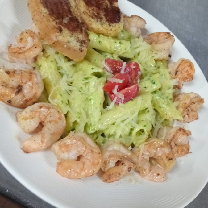 DELICIOSA MEZCLA DE PESTO CILANTRO CON CAMARONES PICOSITOS A LA PLANCHA