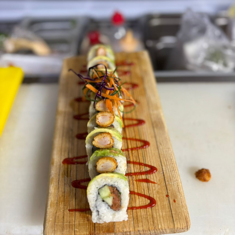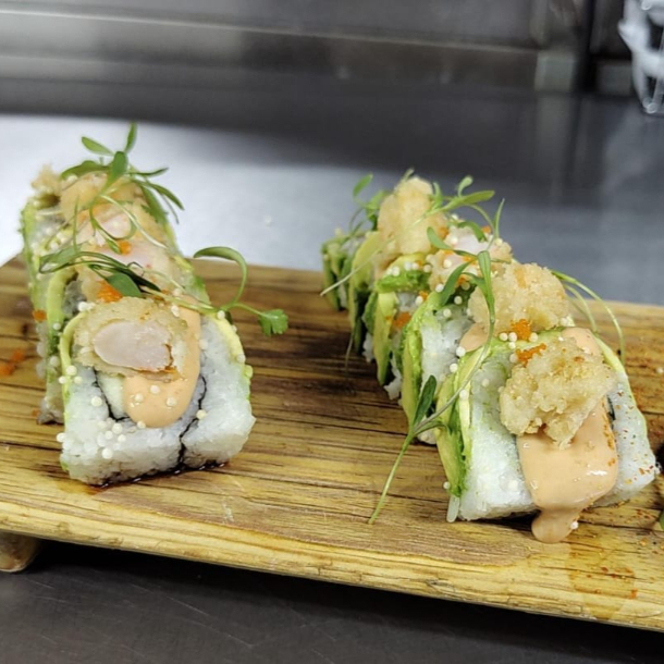rollo relleno de atun spicy y pepino envuelto en laminas de aguacate, acompañados de trozos de camaron