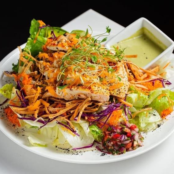 MEZCLA DE LECHUGAS ,ARANDANOS ,QUESO CACAHUATE Y NUESTRO PECHUGA AL COCO