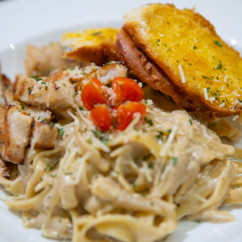 DELICIOSA PASTACONBINADA CON NUSTRA SALSA ALFREDO Y PECHUGA DE POLLO A LA PLANCHA