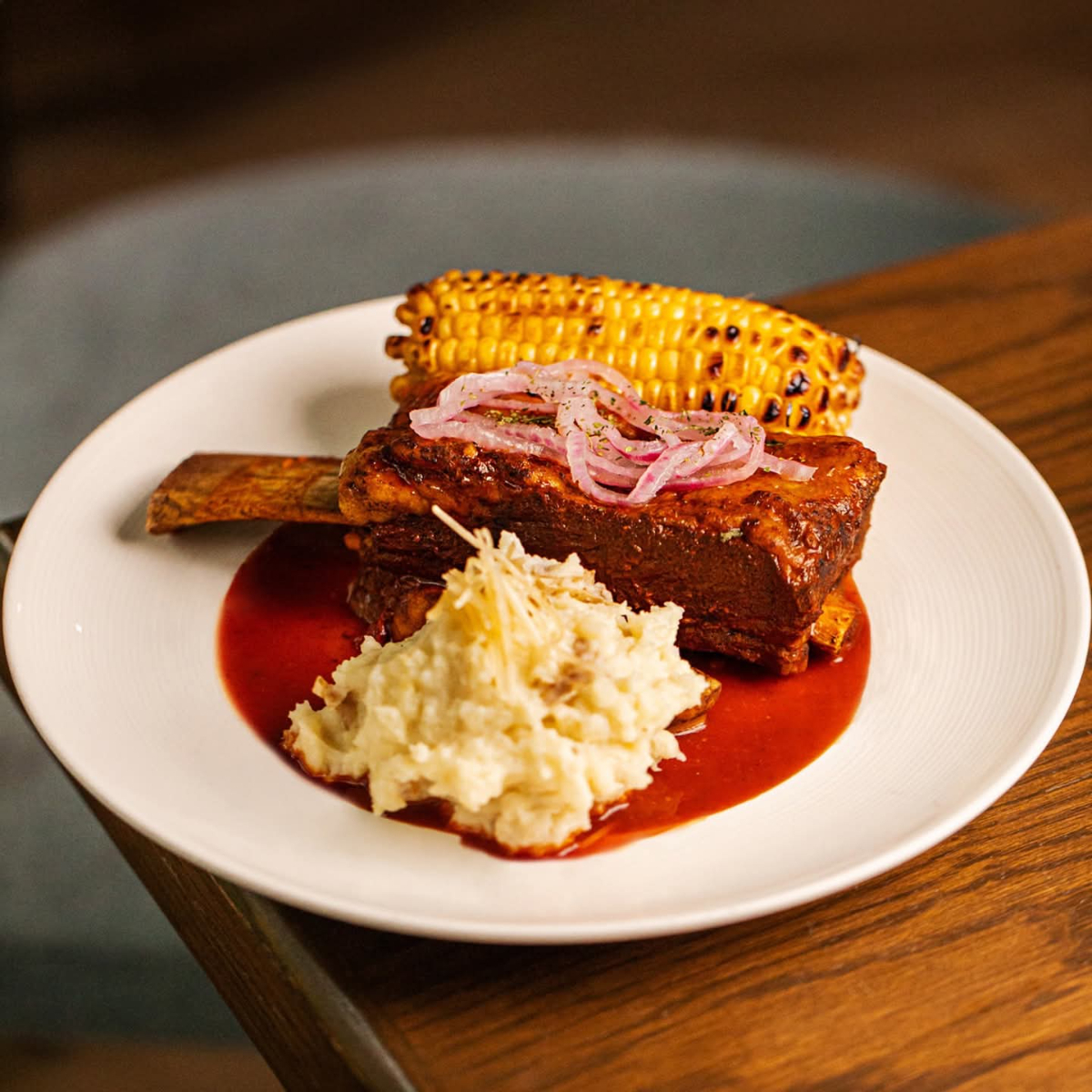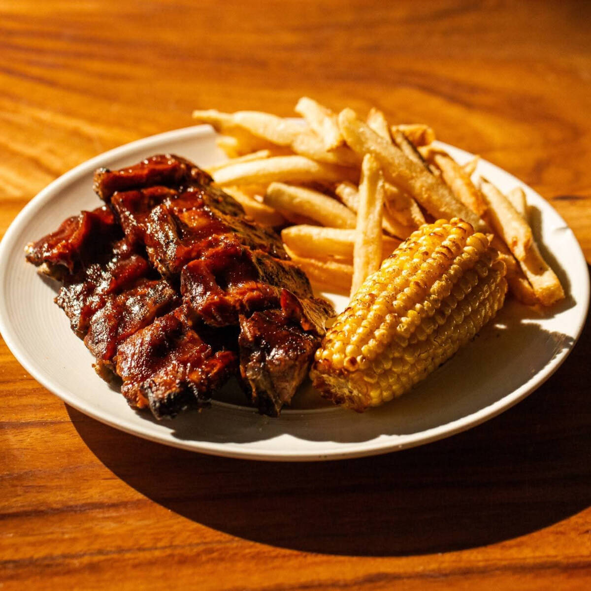 COSTILLAS DE CERDO COCIDA AL VAPOR CON SALSA BBQ ,ELOTE Y PAPAS FRANCESA