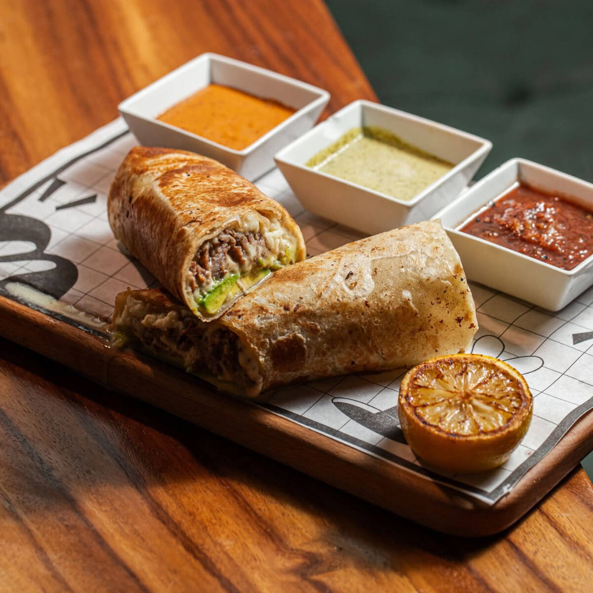 tortilla de harina sonorense ,jugoso diezmillo ,aguacate ,pico de gallo ,col y aderezo chipotle