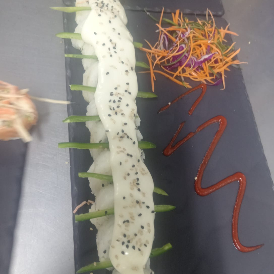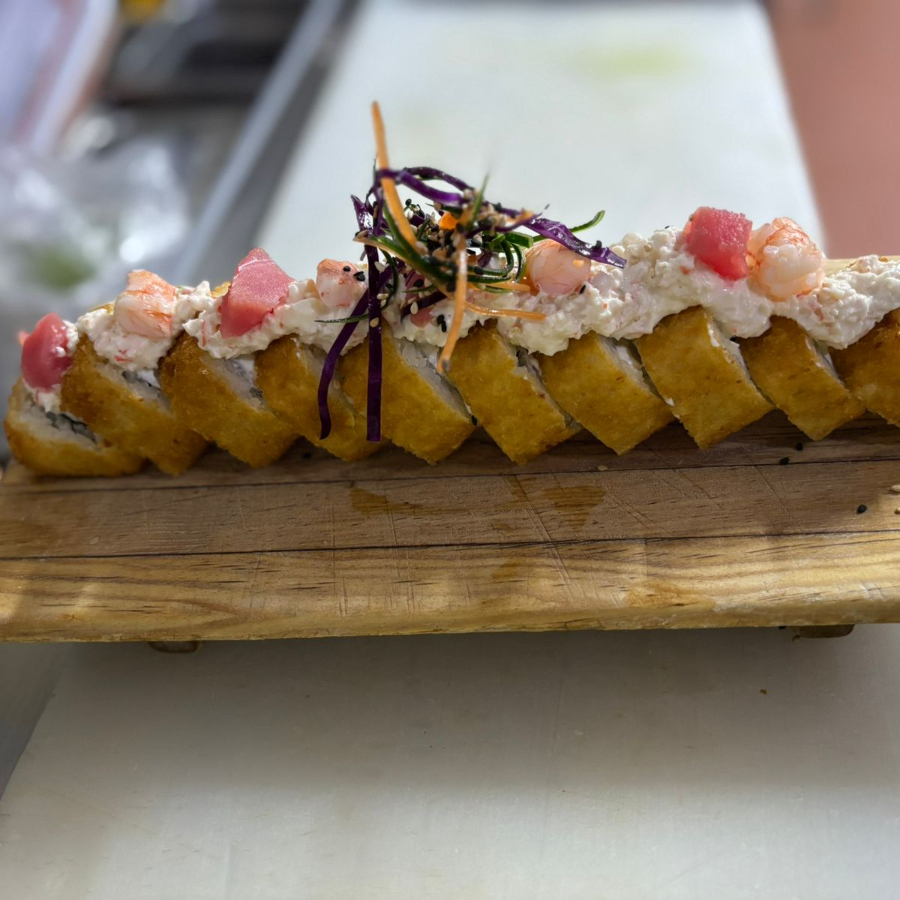 rollo relleno de queso crema,pepino y aguacate cubierto de salmon sellado , ensalada de cangrejo y ajillo de cascabel