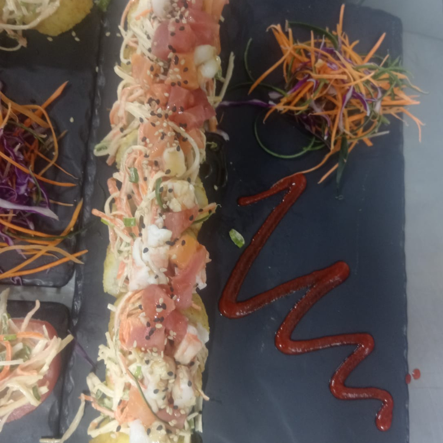 rollo relleno de pepino ,aguacate y camaron,cubierto de atun sellado ,ensalada de cangrejo ajuillo de chile cascabel
