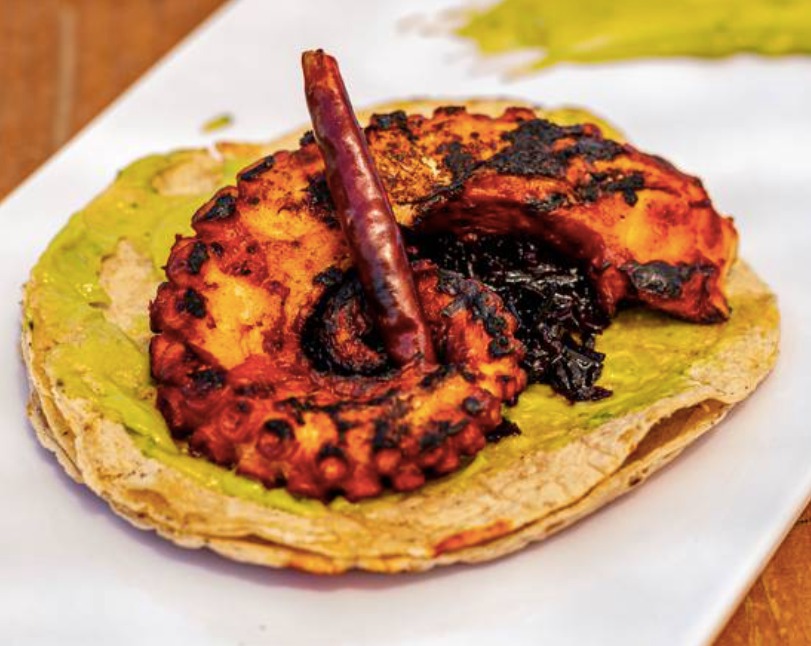 Tentáculo de pulpo zarandeado marinado en adobo de la casa y cocinado en las brasas, servido en tortilla de maíz negro con salsa de aguacate y reducción de flor de Jamaica salteada!!