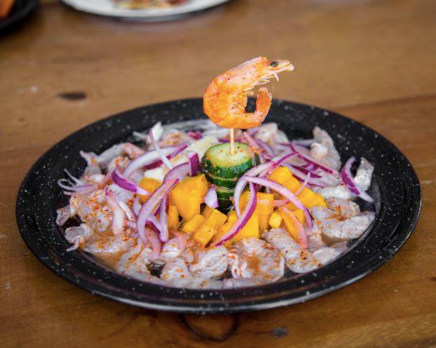 Trozos de pescado marinados en limón y mezclados con jitomate, cebolla, pepino, cilantro y mango sólo en temporada.