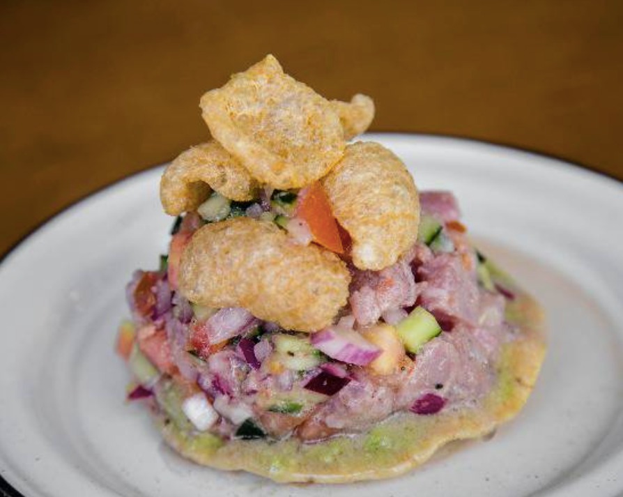 Atún fresco marinado en aceite de ajo y limón, mezclado en verdura bandera, servido en una cama de guacamole, coronado de chicharrón de cerdo.