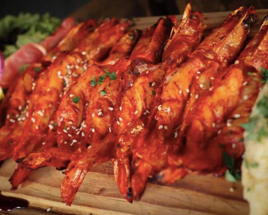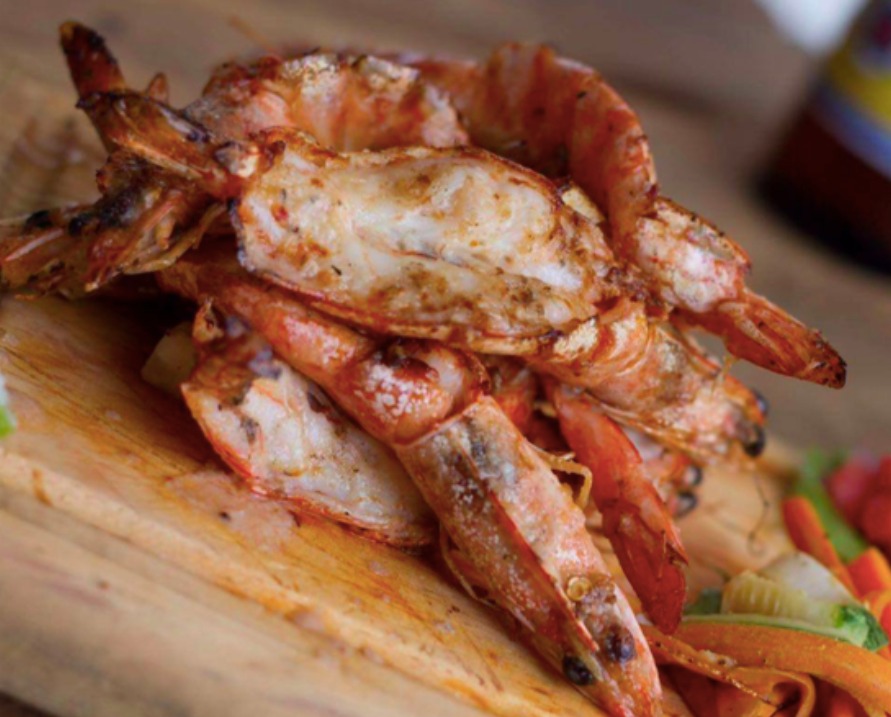 Camarones cocinados a las brasas bañados en aceite de ajo y mantequilla acompañados de puré de papa y ensalada fresca del dí., los preferidos de los europeos!! 250 gramos.