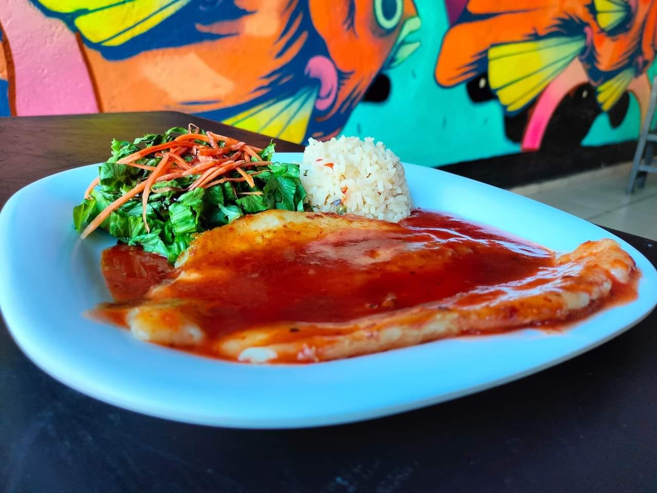 Filete de pescado cocinado en salsa diabla y mantequilla, acompañado de ensalada fresca y arroz. 250 gramos.