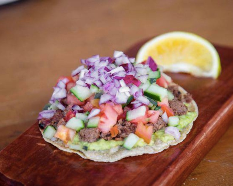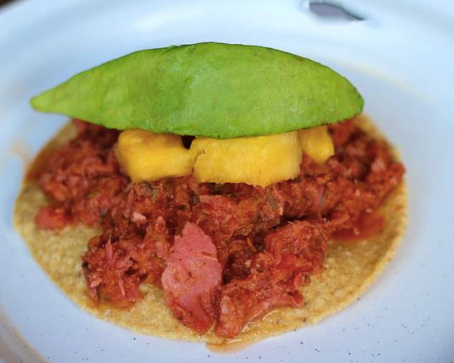 Atún hecho carnitas, montado en guacamole y tortilla de maíz negro coronado con salsa bandera.