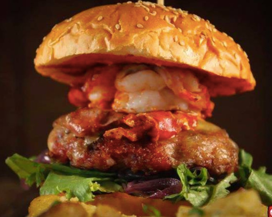 Hamburguesa de res al carbón coronada de un medallón de camarón y tocino cocinado a las brasas, queso oaxaca, cebolla caramelizada montada en pan de hamburguesa. Acompañada de puré de papa Imperdible!!