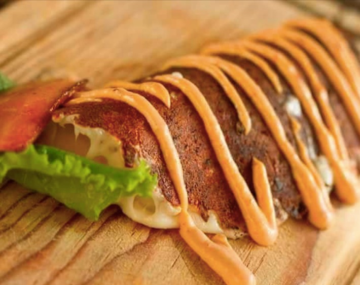 Taco de queso gratinado relleno de camarones zarandeados, decorado con aderezo de chipotle. Otro clásico de camarón chelero!!