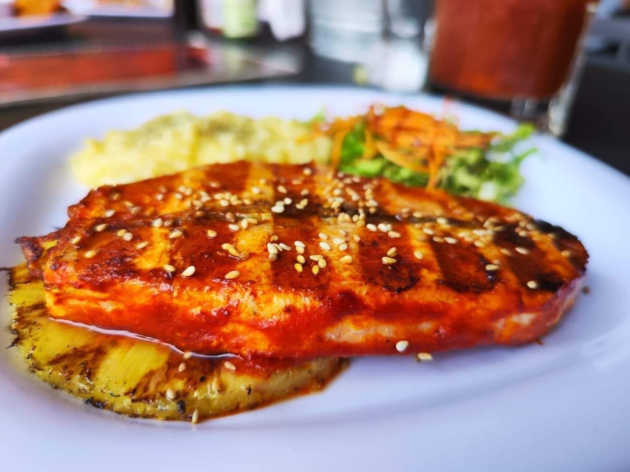 Salmón chileno marinado en adobo de la casa, cocinado a la parrilla, acompañado de piña asada, puré de papa y ensalada fresca del día. 200 gramos.