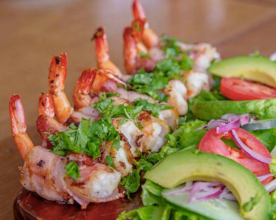 Camarones rellenos de queso, forrados en tocino, montados en una cama de mermelada con chile chiltepín y piña asada. Acompañados de arroz y ensalada. Mis preferidos!! 350 gramos.