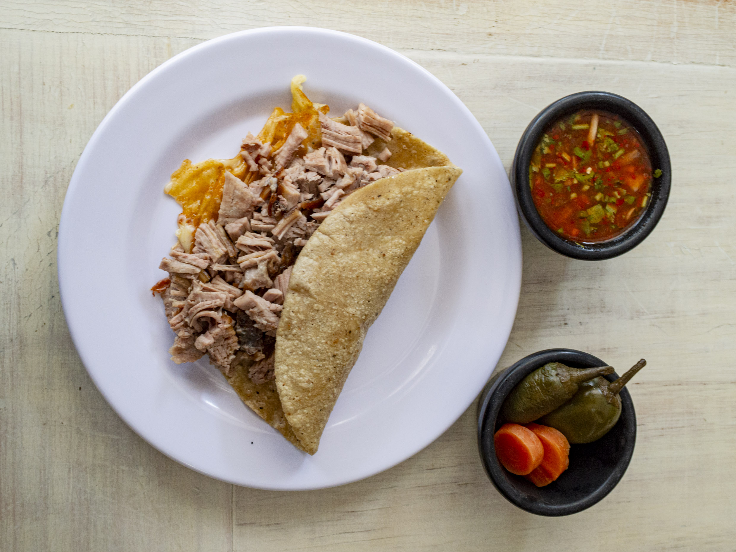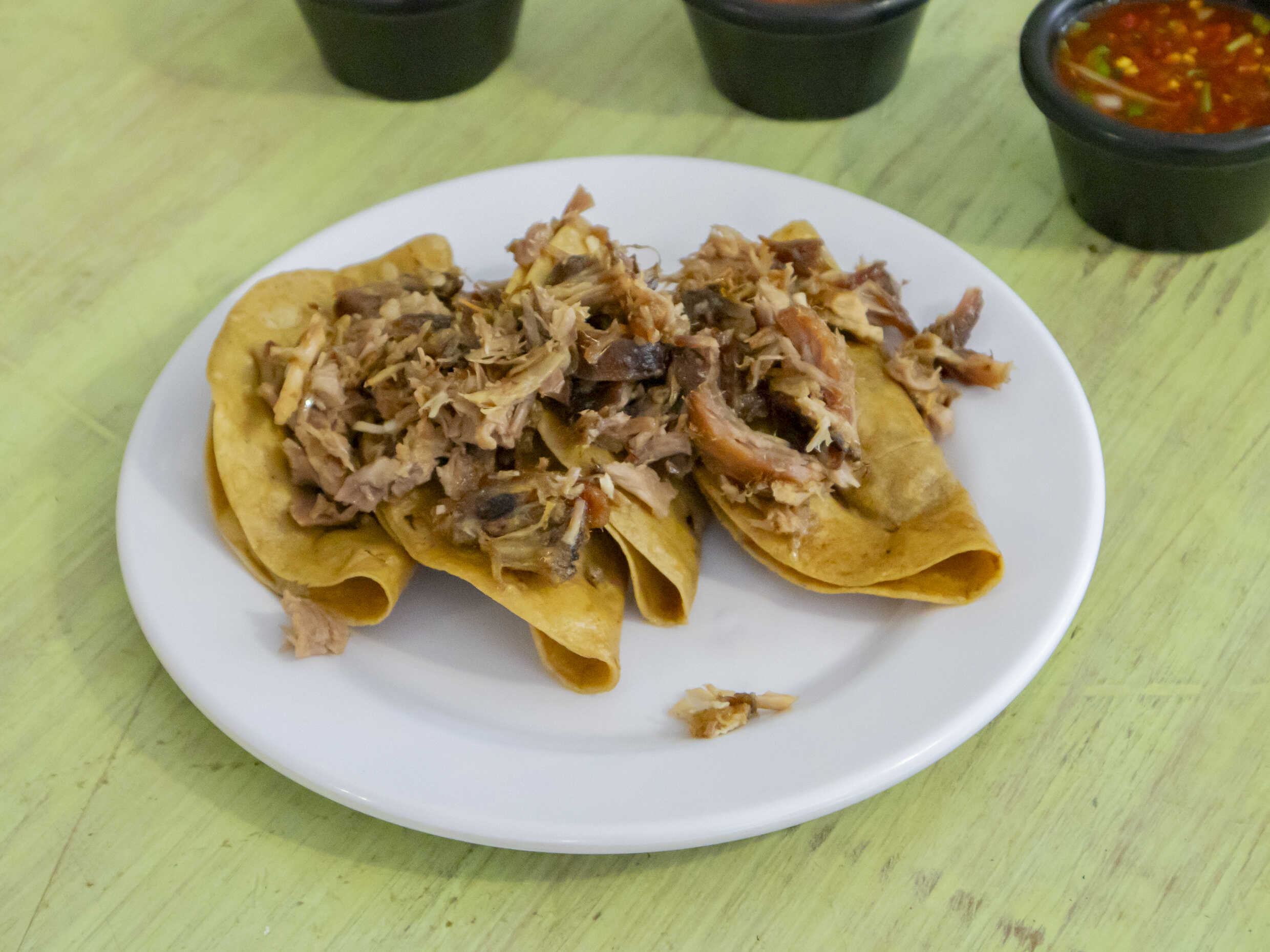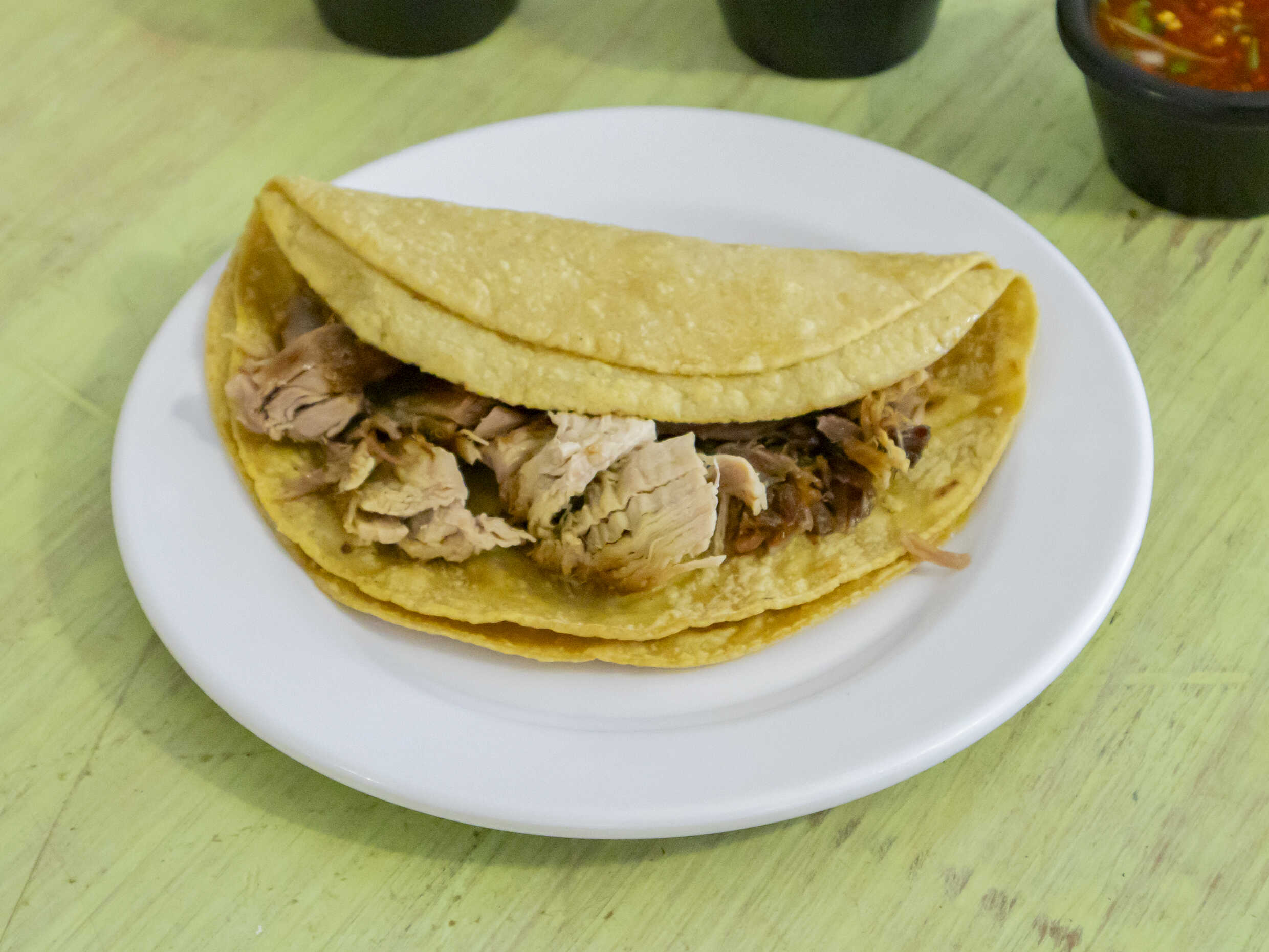 Taco de carnitas surtido con 2 tortillas hechas a mano, salsa a elegir.
