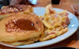 Mini hot cakes esponjosos, acompañados de huevos revueltos con jamón y una bebida a elección: jugo natural o leche. Un desayuno perfecto para los niños