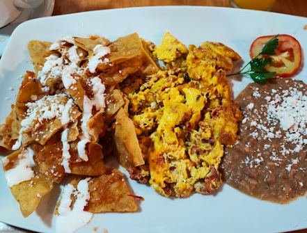 Huevos revueltos con jitomate, cebolla y chile verde, acompañado de frijoles refritos cremosos. Servido con tortillas calientes para un desayuno lleno de sabor mexicano.