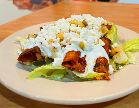 Tortillas suaves bañadas en una salsa de frijoles cremosa, rellenas de queso fresco. Servidas con crema, queso rallado, cebolla, acompañadas de una guarnición de salsa casera para un desayuno tradicional y reconfortante