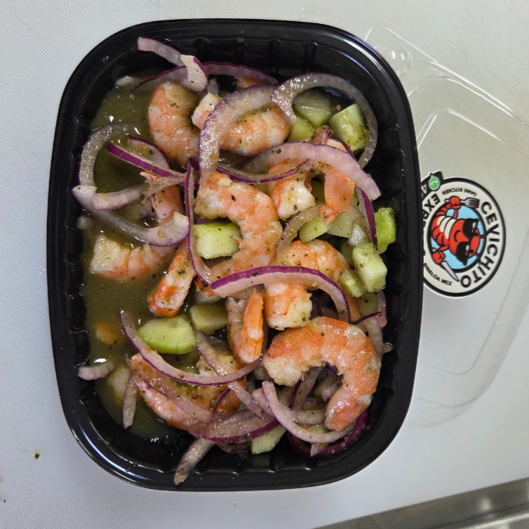 Camarones frescos marinados en una mezcla de limón, pimienta, chile, pepino y cebolla morada. Un platillo refrescante, picosito y lleno de sabor, perfecto para abrir el apetito o disfrutar como plato fuerte. ¡Ideal para los amantes del marisco y lo enchilado! Bowl individual, acompañados de bolsa de tostadas 5 pzas.