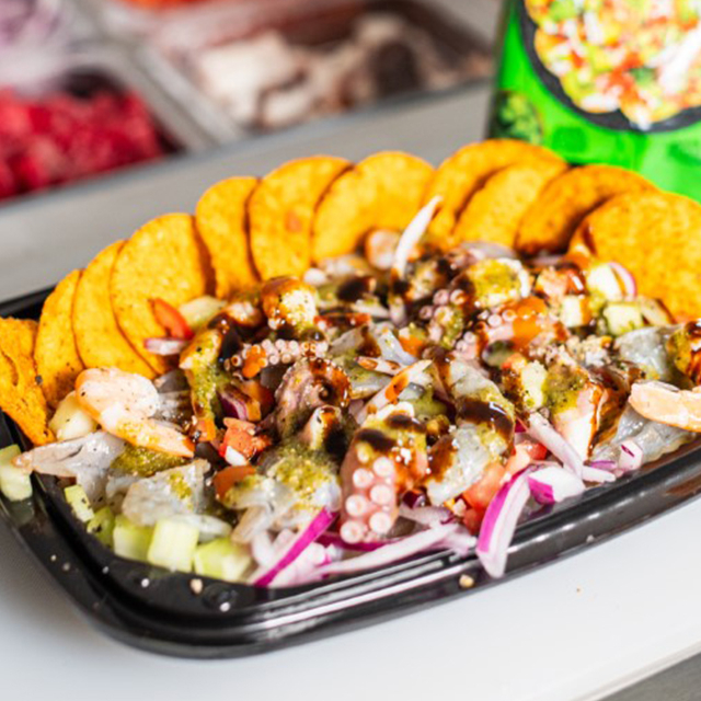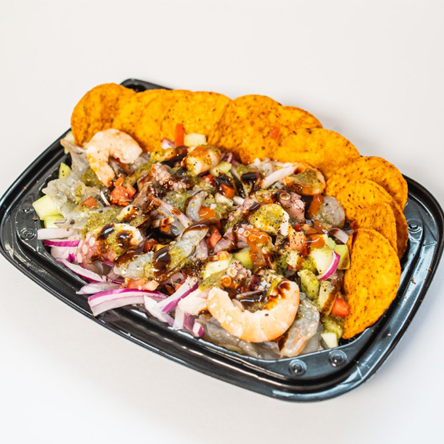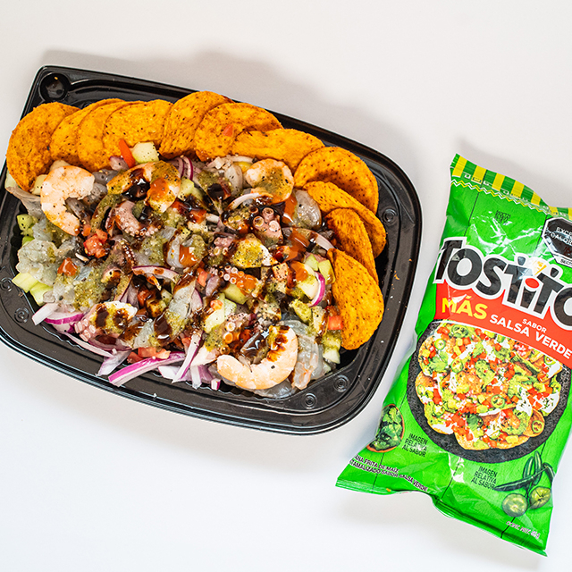 Nuestro delicioso aguachile con 3 opciones de mariscos mezclados (225gr), montado en una cama de tostitos, perfectos para calmar el hambre con mucho estilo.