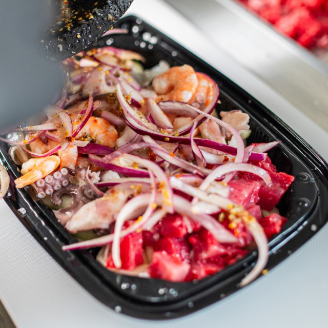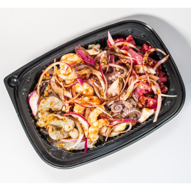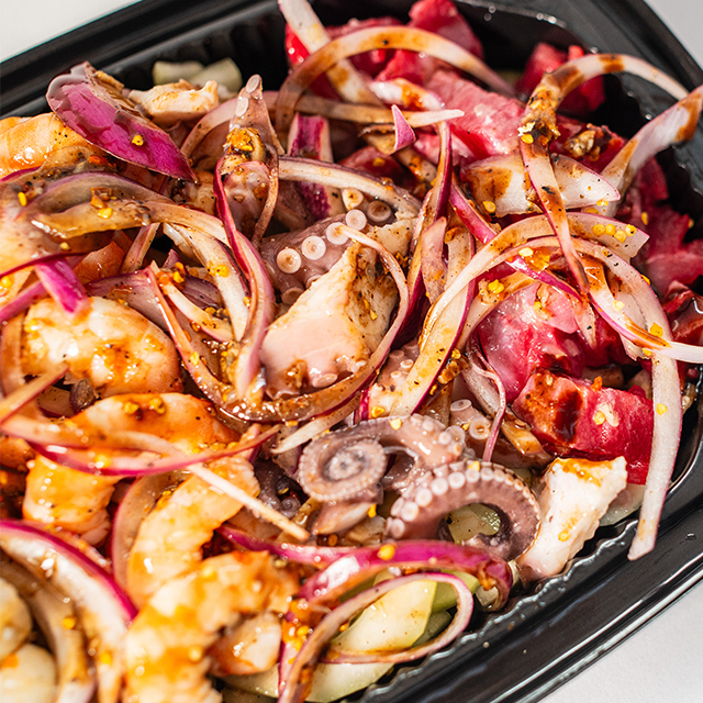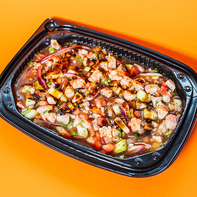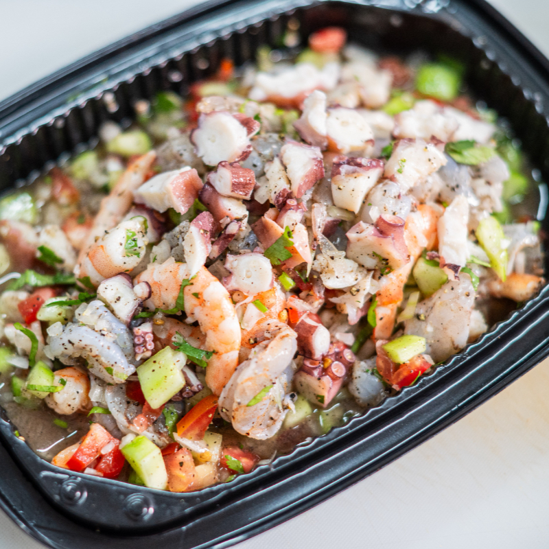 Deliciosa combinación de pulpo frescos, mezclado con el marisco de tu preferencia, marinados en limón con chile, pepino, cebolla morada y un toque de pimienta. Una explosión de sabor marino, picosito y refrescante, perfecta para disfrutar en grande. ¡El favorito de los que lo quieren todo! Bowl individual, acompañados de bolsa de tostadas 5 pzas.