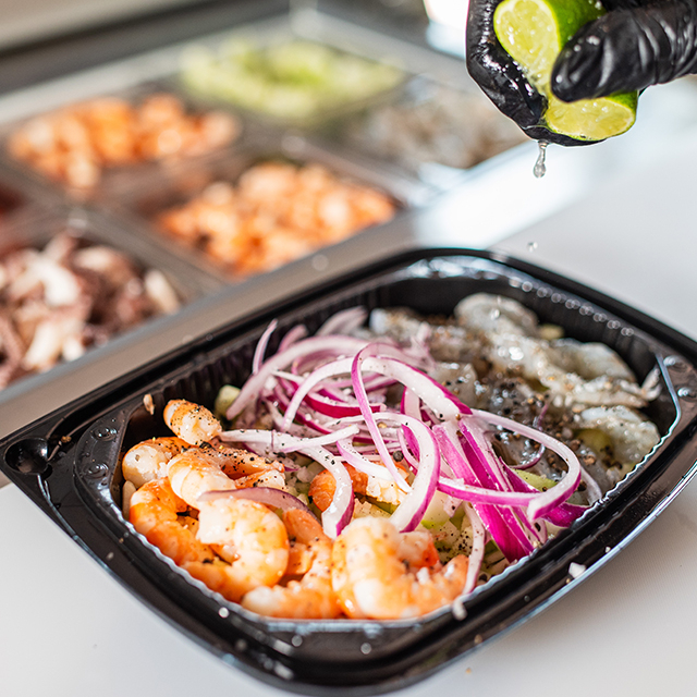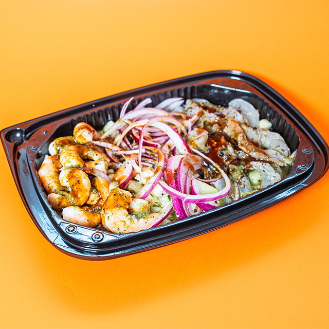 Elige 2 mariscos, camarones crudos, cocidos, o atun fresco, marinados en una mezcla de limón, pimienta, chile, pepino y cebolla morada. Un platillo refrescante, picosito y lleno de sabor, perfecto para abrir el apetito o disfrutar como plato fuerte. ¡Ideal para los amantes del marisco y lo enchilado! Bowl individual, acompañados de bolsa de tostadas 5 pzas.