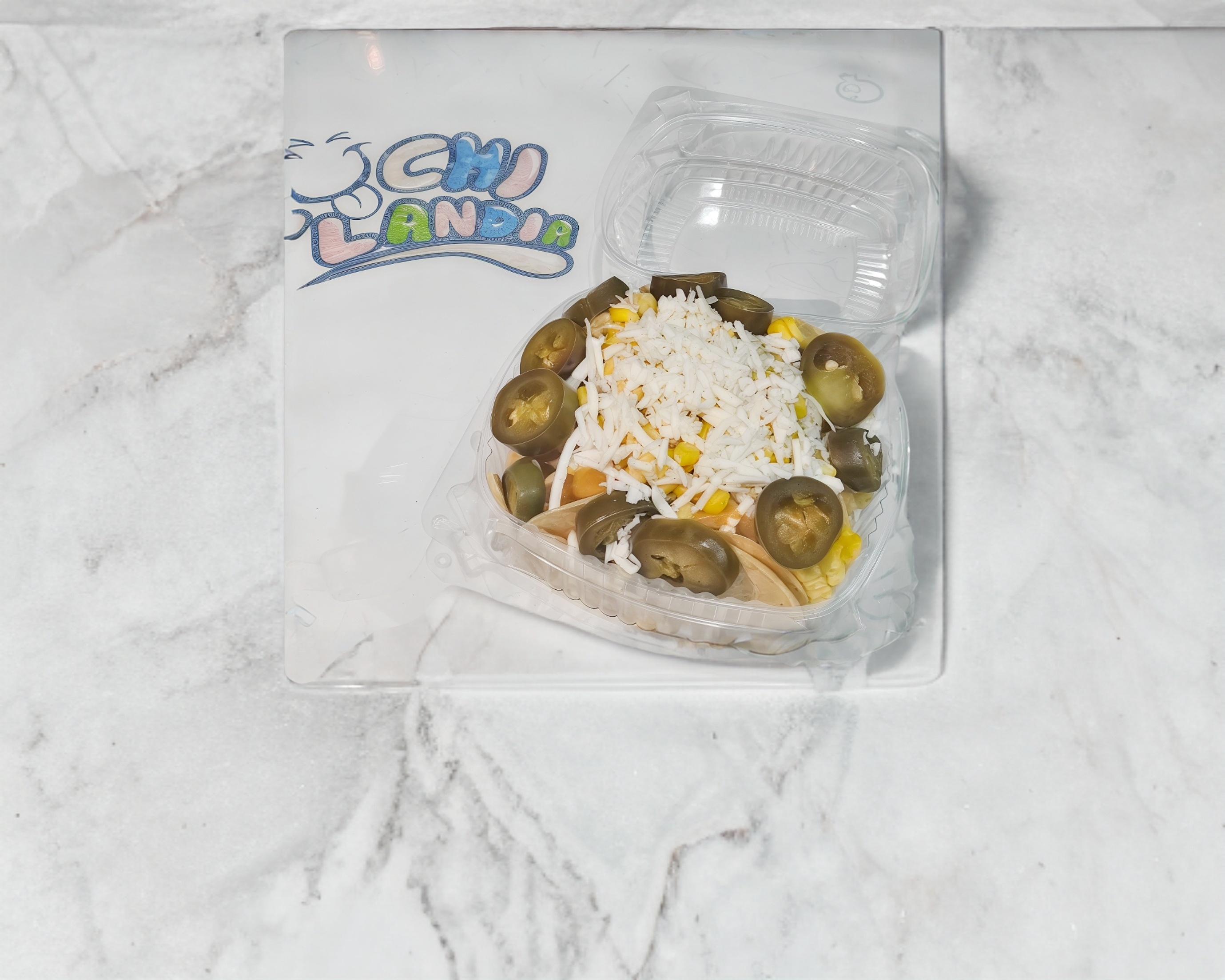 Porción de nachos con elote, queso amarillo, queso de elote y jalapeños.