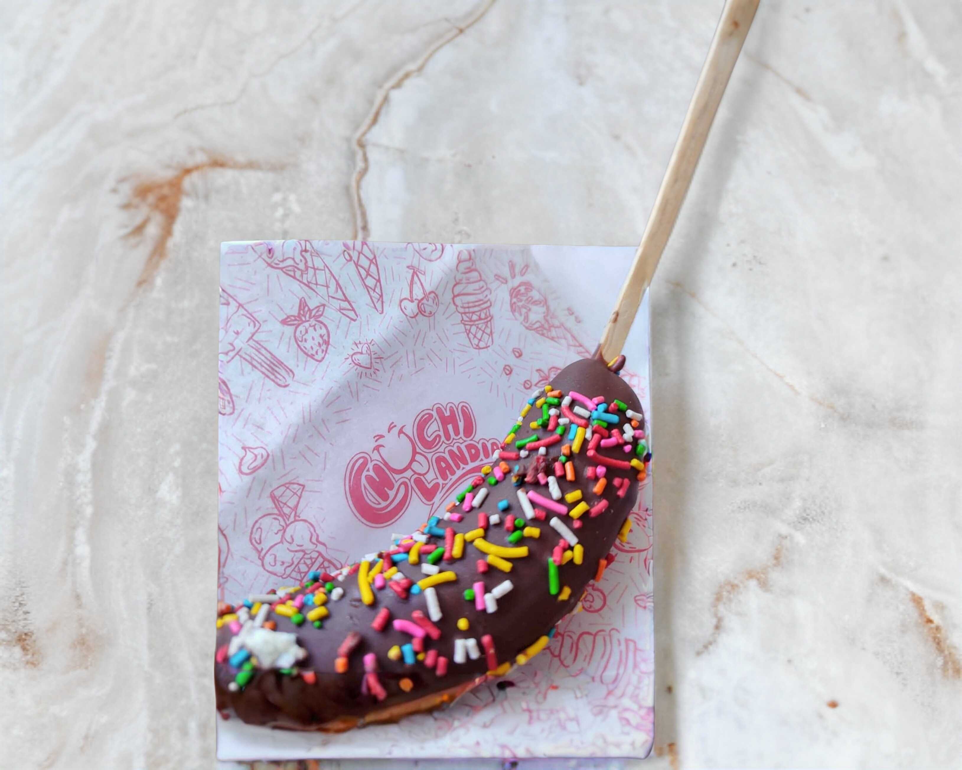 Porción de 1 banana cubierta con chocolate y chispas de colores.