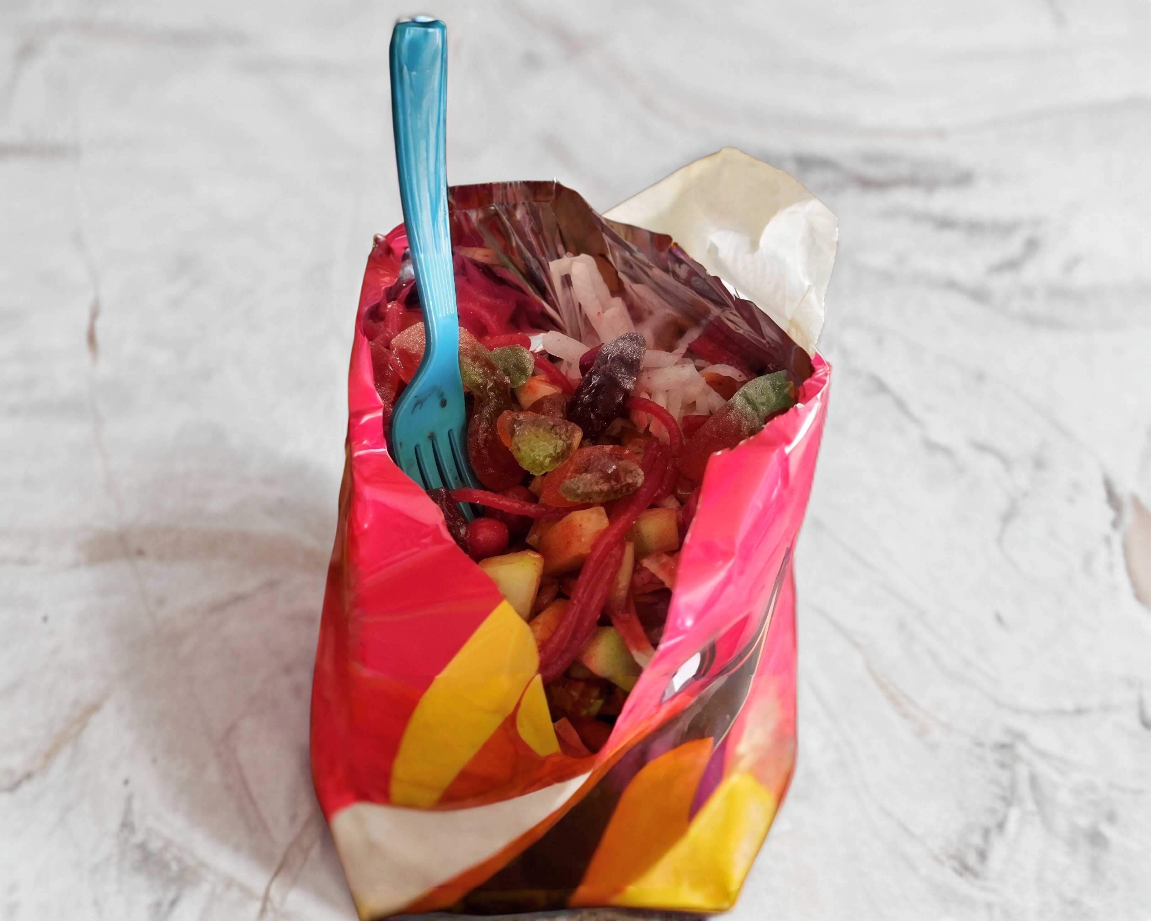 Repollo, pico de gallo, pepino, jícama, zanahoria, cueritos, churros de masa y cacahuates.