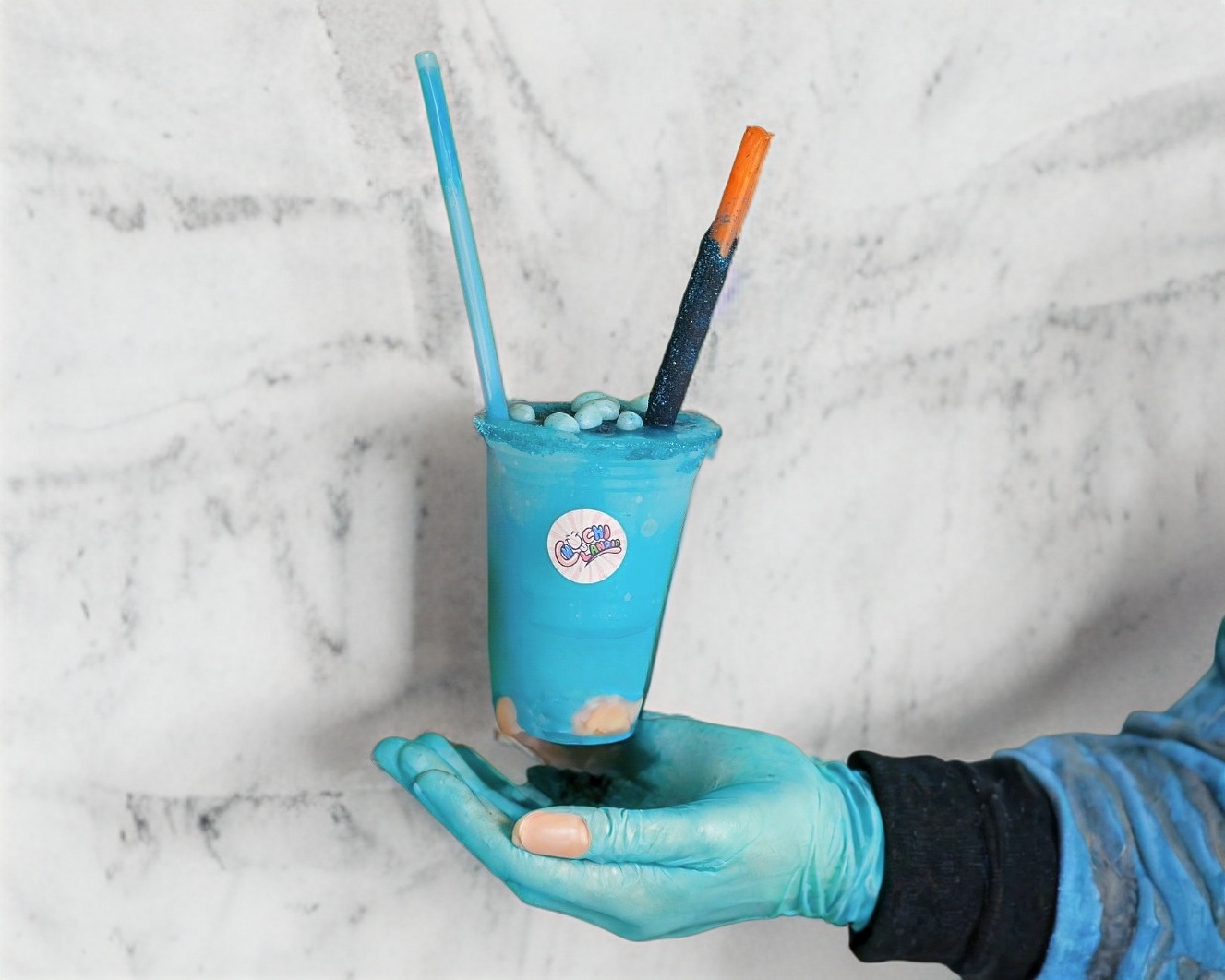 Granizado de sabor mora azul, con miguelito de mora y banderilla azul.