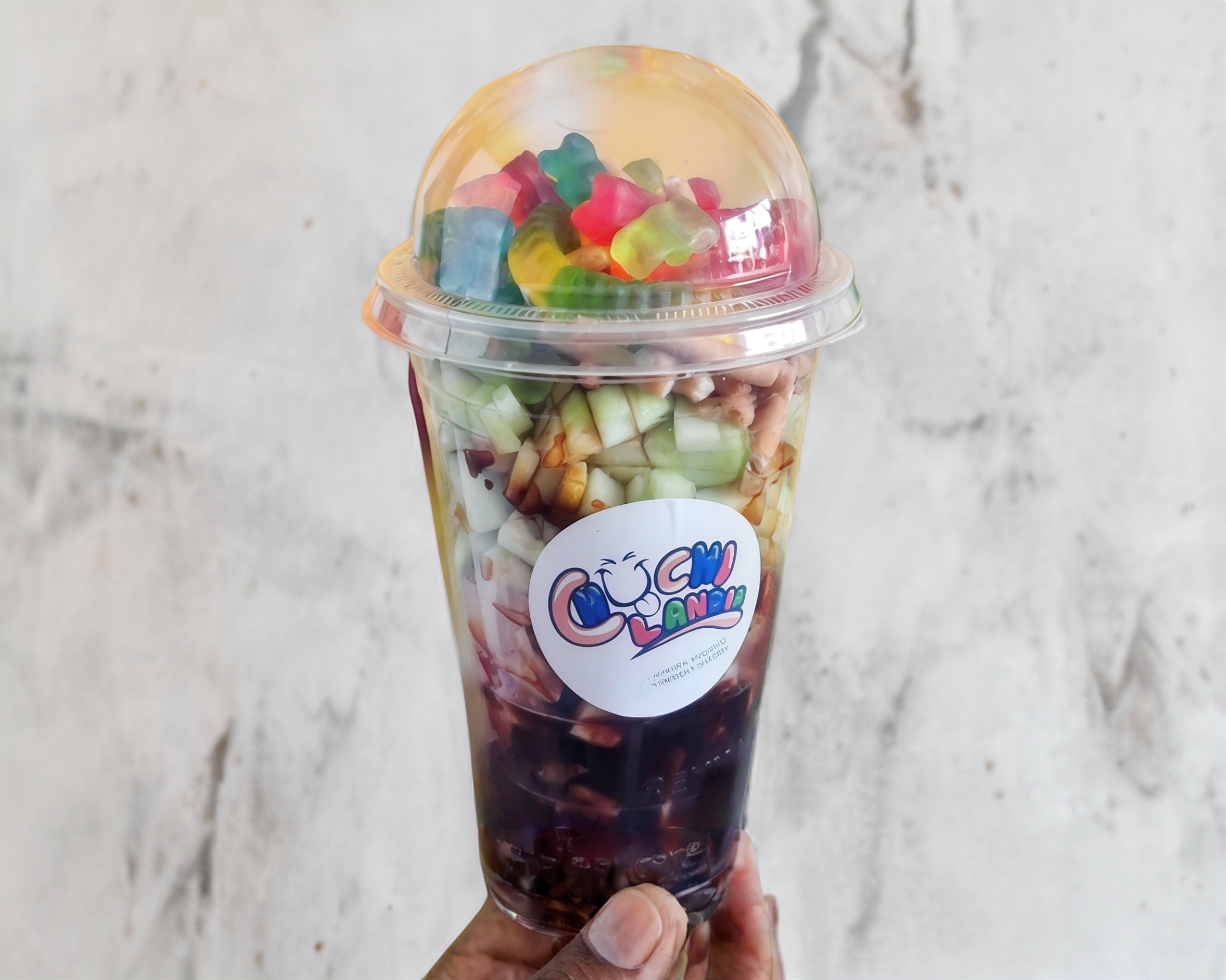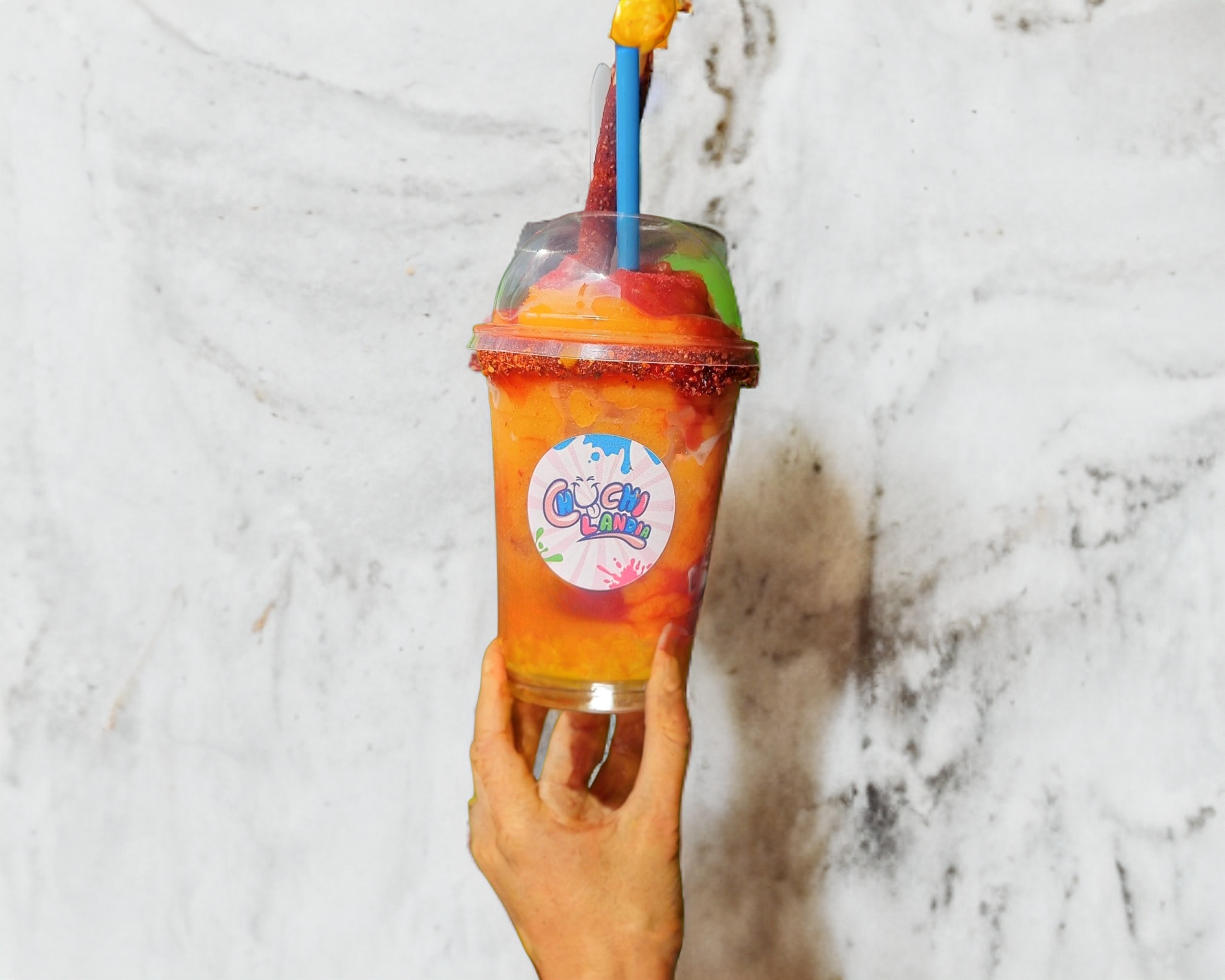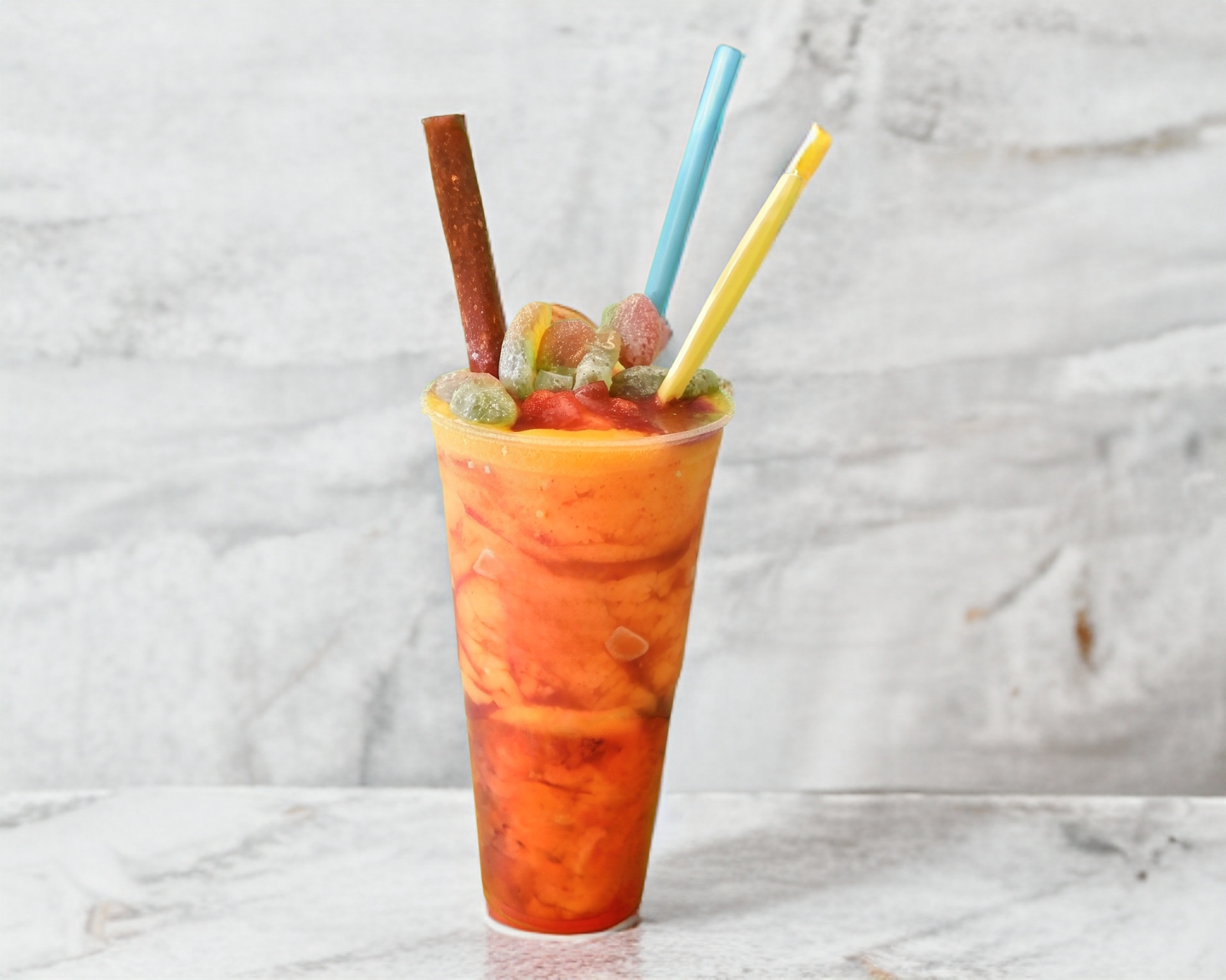 Granizado con 2 toppings de la barra, chamoy y Miguelito.