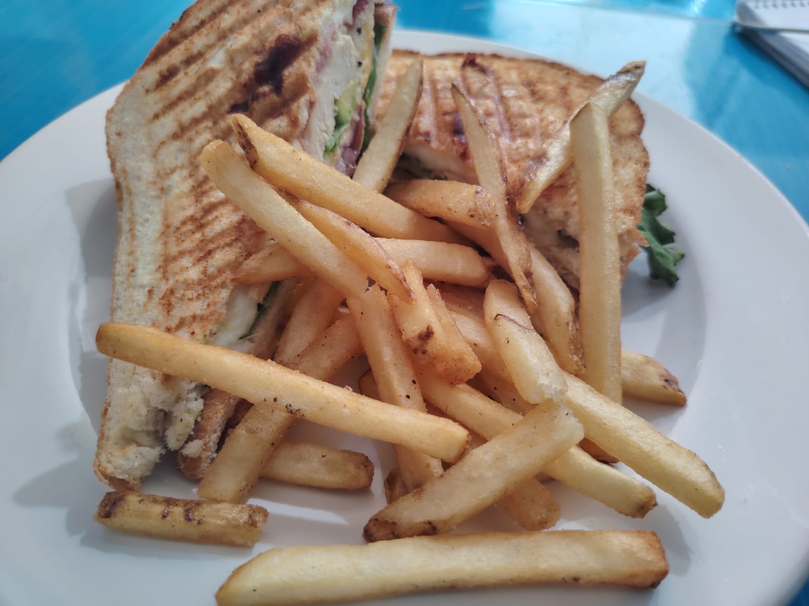 1 porcion personal de Club Sándwich Jamón de pavo , pollo a la plancha , tocino, queso asadero, queso amarillo, aguacate, jitomate, lechuga y chiles en vinagre, acompañado de papas a la francesa.(150 gramos )