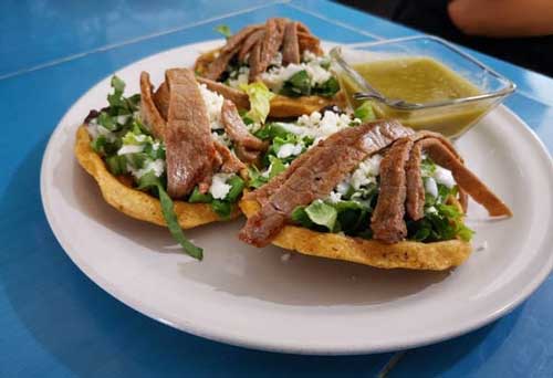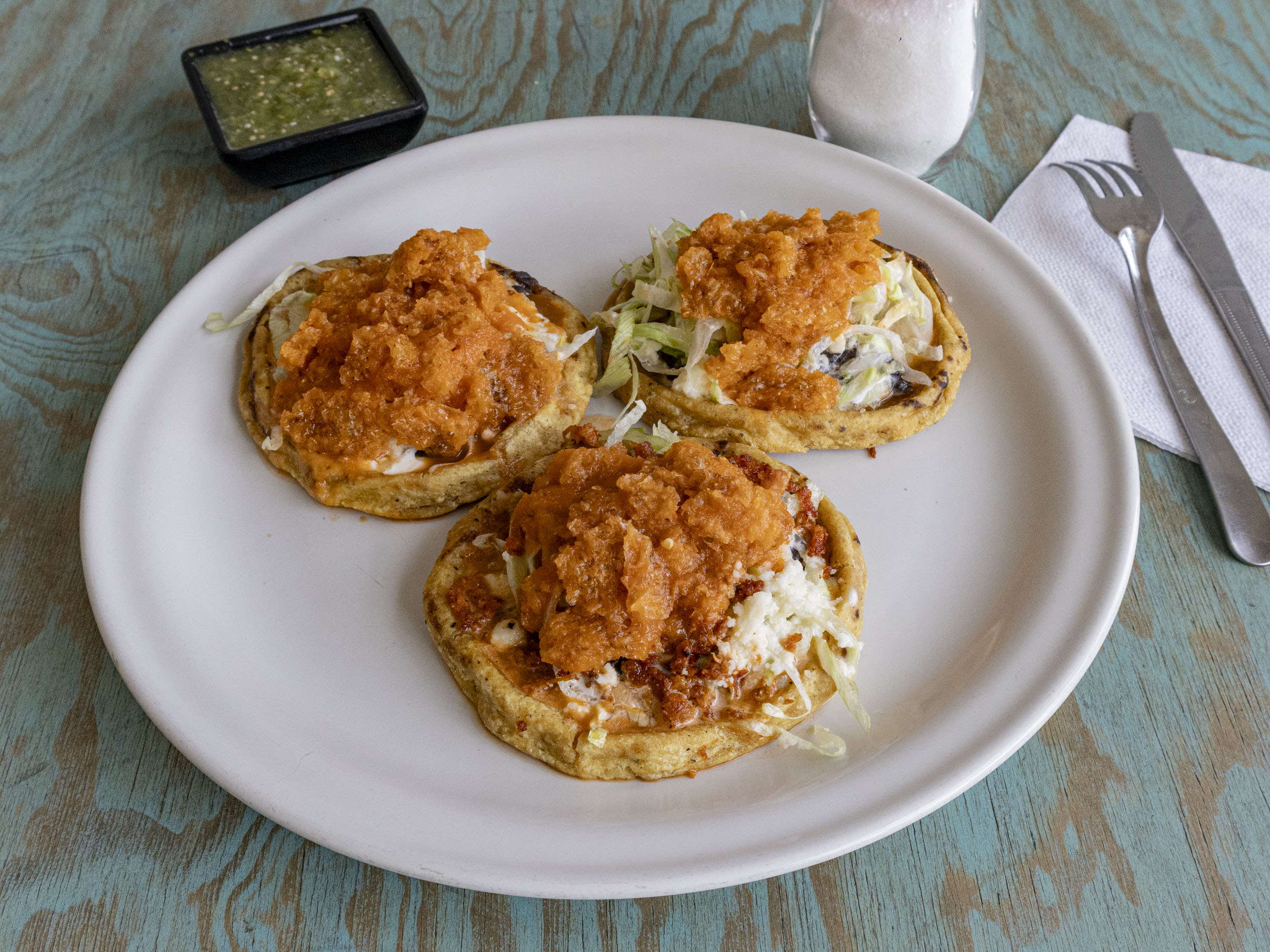 Con huevo estrellado o revuelto, acompañados de frijoles refritos. Salsa a escoger: verde, roja, morita, guajillo o divorciados.