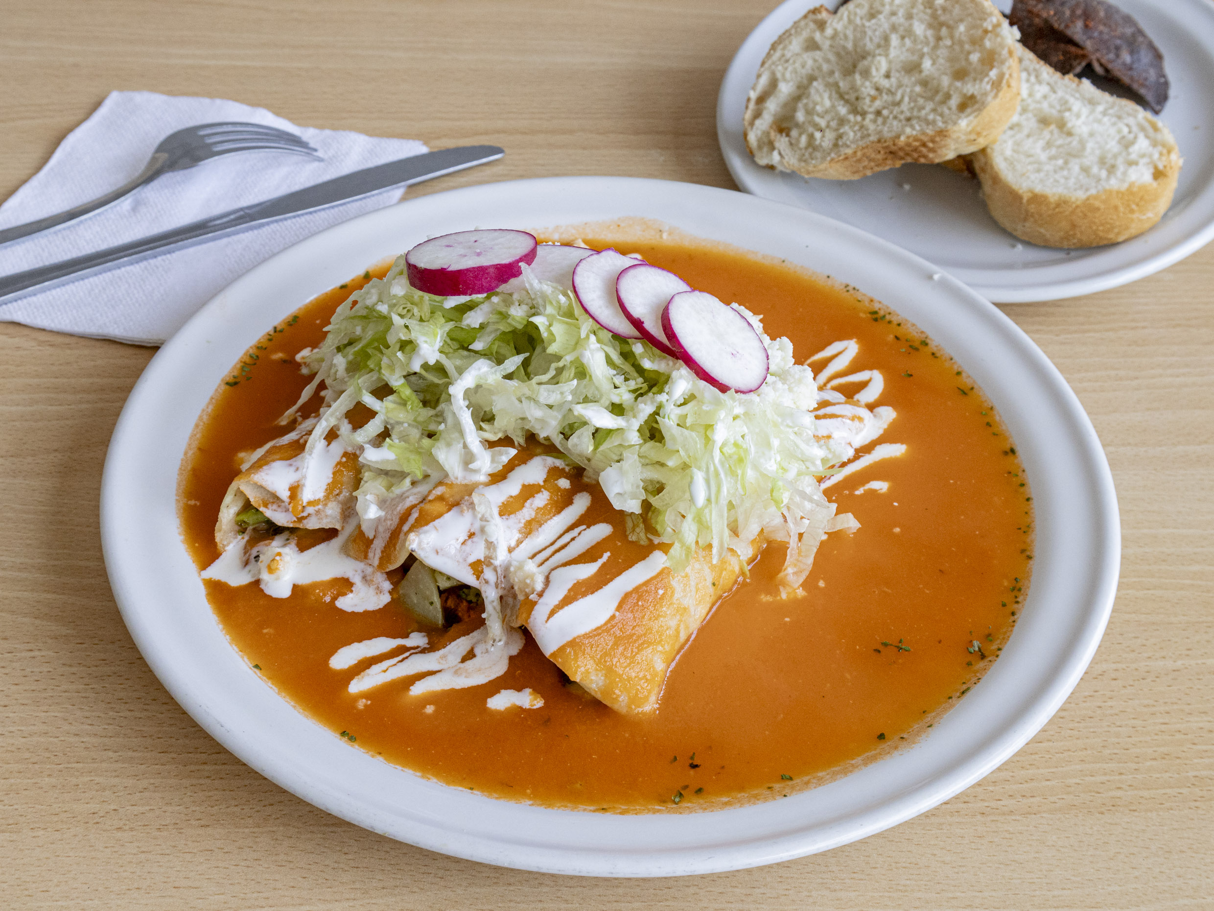 Rellenas de huevo con chorizo, bañadas en salsa de guajillo, con lechuga, crema y queso, acompañadas de frijoles refritos.