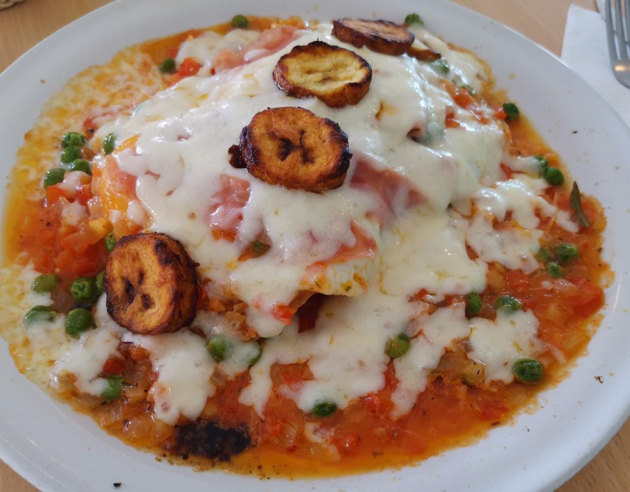 Estrellados sobre una tortilla frita con frijoles refritos, bañados en salsa de jitomate con chícharos, tiras de jamón, plátano macho y gratinados.